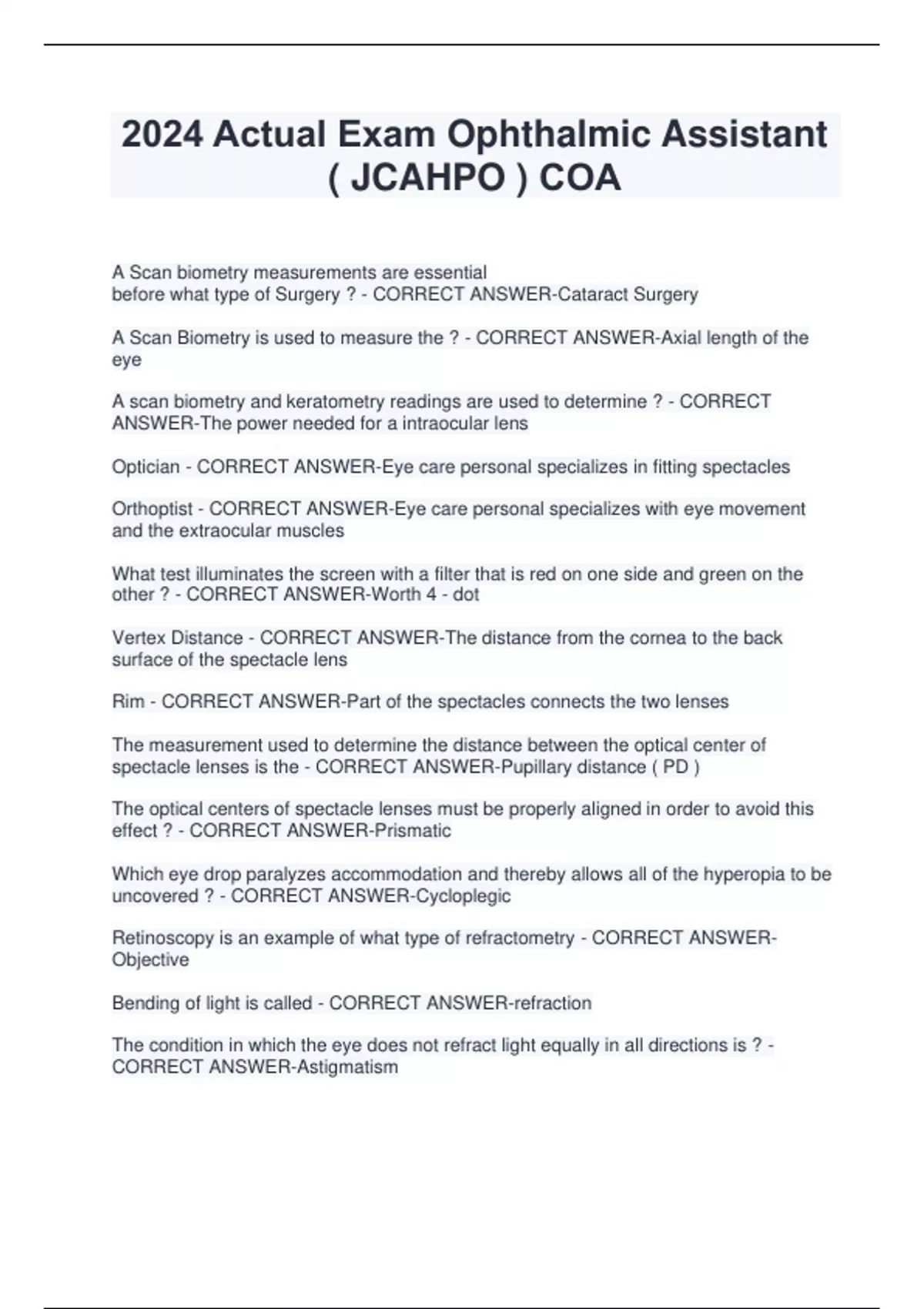 2024 Actual Exam Ophthalmic Assistant ( JCAHPO ) COA