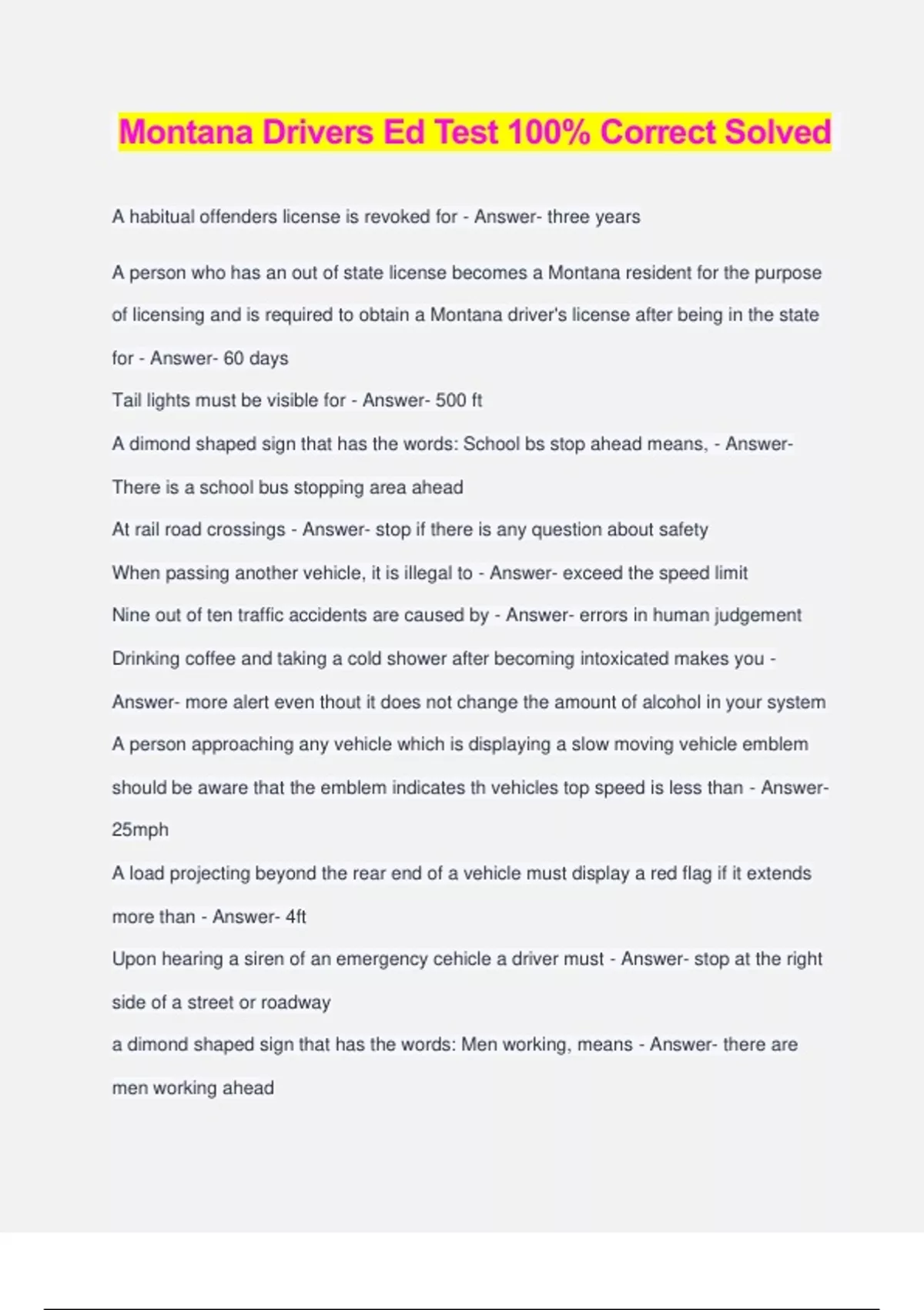 Montana Drivers Ed Test 100% Correct Solved A habitual offenders license is revoked for - Answer- three years A person who has an out of state license becomes a Montana resident for the purpose of licensing and is required to obtain a Montana driver's license after being in the state for - Answer- 60 days Tail lights must be visible for - Answer- 500 ft A dimond shaped sign that has the words: School bs stop ahead means, - Answer- There is a school bus stopping area ahead At rail road crossings - Answer- stop if there is any question about safety When passing another vehicle, it is illegal to - Answer- exceed the speed limit Nine out of ten traffic accidents are caused by - Answer- errors in human judgement Drinking coffee and taking a cold shower after becoming intoxicated makes you - Answer- more alert even thout it does not change the amount of alcohol in your system A person approaching any vehicle which is displaying a slow moving vehicle emblem should be aware that the emblem indicates th vehicles top speed is less than - Answer- 25mph A load projecting beyond the rear end of a vehicle must display a red flag if it extends more than - Answer- 4ft Upon hearing a siren of an emergency cehicle a driver must - Answer- stop at the right side of a street or roadway a dimond shaped sign that has the words: Men working, means - Answer- there are men working ahead If you approach a turn in the wrong lane, or you have forgotten to signal, you should - Answer- proceed straight ,get in the proper lane, go to the next intersection, signal, then turn Headlights must illuminate persons and objects for - Answer- 350 feet on high beam and 100 ft on low beam A driver, upon meeting or overtaking a school bus from either direction which has stopped on the highway with its red lights flashing must - Answer- stop before reaching the bus and not proceed untill the red lights have been extinguished The sign picture below means - Answer- there is a side road entering the highway from the right Montana law defines Reckless Driving as - Answer- Driving with willful and wanto disregard for the safety of persons or property A diamond shaped sign with the words, Road Work Ahead , means - Answer- the highway ahead is being repaired: approach with caution A diamond shaped sign with words: Loose gravel, means - Answer- the highway ahead is covered with loose gravel A diamond shaped sign with the words SCHOOL means - Answer- youu must watch for children in this area at all times