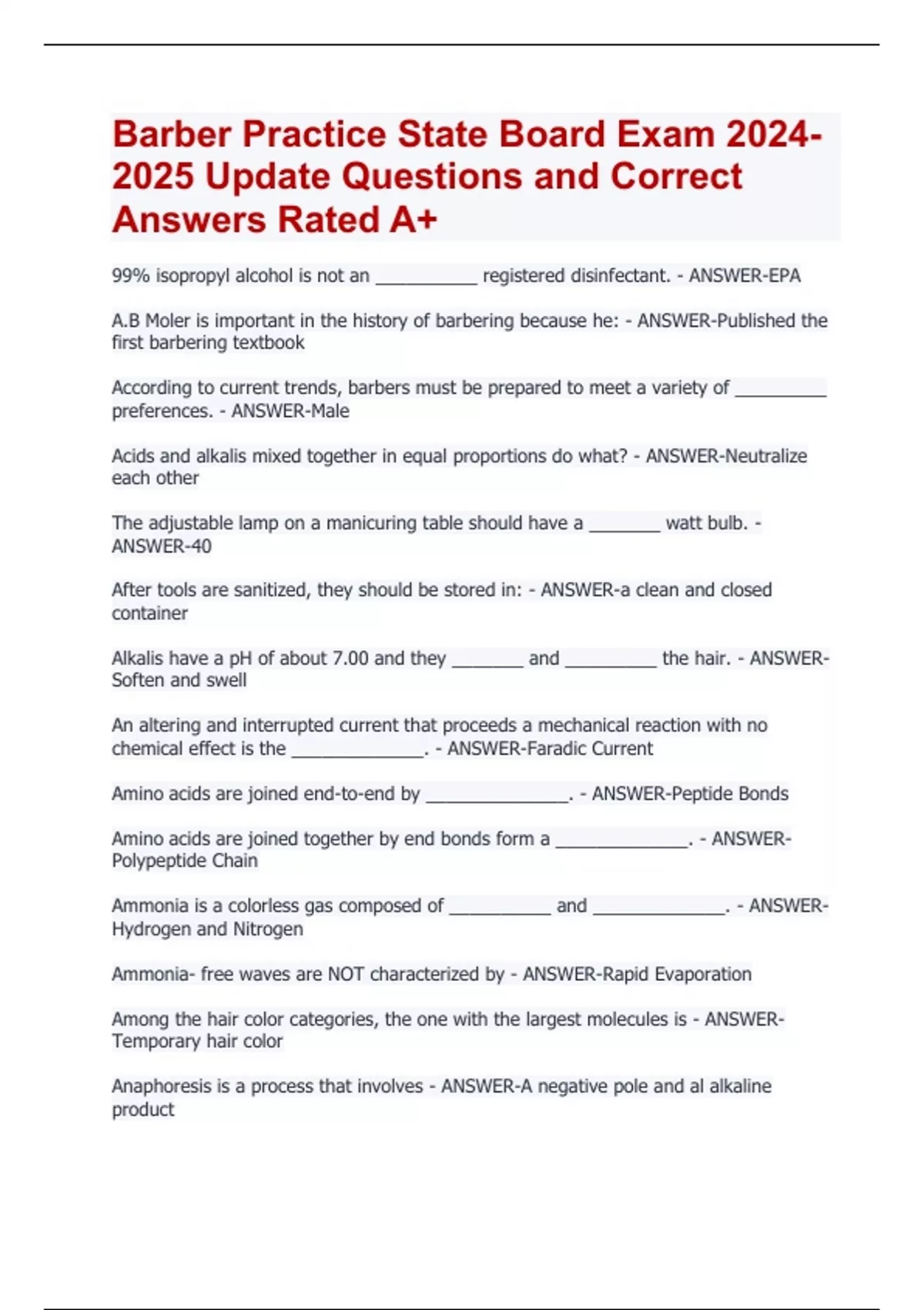 Barber Practice State Board Exam 2024- 2025 Update Questions and Correct Answers Rated A+