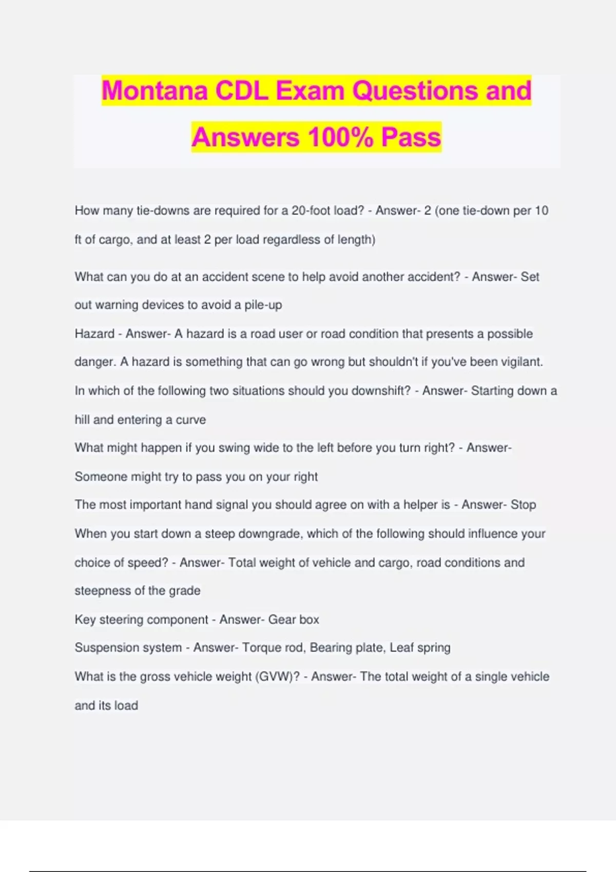 Montana CDL Exam Questions and Answers 100% Pass How many tie-downs are required for a 20-foot load? - Answer- 2 (one tie-down per 10 ft of cargo, and at least 2 per load regardless of length) What can you do at an accident scene to help avoid another accident? - Answer- Set out warning devices to avoid a pile-up Hazard - Answer- A hazard is a road user or road condition that presents a possible danger. A hazard is something that can go wrong but shouldn't if you've been vigilant. In which of the following two situations should you downshift? - Answer- Starting down a hill and entering a curve What might happen if you swing wide to the left before you turn right? - Answer- Someone might try to pass you on your right The most important hand signal you should agree on with a helper is - Answer- Stop When you start down a steep downgrade, which of the following should influence your choice of speed? - Answer- Total weight of vehicle and cargo, road conditions and steepness of the grade Key steering component - Answer- Gear box Suspension system - Answer- Torque rod, Bearing plate, Leaf spring What is the gross vehicle weight (GVW)? - Answer- The total weight of a single vehicle and its load On which of the following types of fires should you NOT use a B:C fire extinguisher? - Answer- Wood, paper, cloth (anything you can use water on) Which of the following statements about retarders are correct? - Answer- They slow vehicle, reduce need for braking, need to be turned off if the road is wet, icy or snow- covered, It make cause you to skid if your drive wheels have poor traction Always try to back toward the driver's side because - Answer- You can see better, watching the vehicle's rear from the side window Which of the following should you NOT do if you experience a tire failure? - Answer- Brake hard and immediately (you should brake gently after the vehicle has slowed down) Four basic skills that operating a commercial vehicle requires? - Answer- Backing safely, Accelerating, Steering, Stopping How long does it take a typical tractor-trailer to clear a double railroad track? - Answer- More than 15 seconds for double and 14 for single track Basic method for shifting up? - Answer- You must release the accelerator, press the clutch and shift into neutral at the same time, release the clutch, let the engine and gears slow to the required rpm for the next gear, press the clutch and shift into a higher gear at the same time, then release the clutch and press the accelerator at the same time. Acceleration is not involved until the very end, and definitely not while pressing the clutch. On wet roads, you should reduce your speed by - Answer- one-third You don't want to be a distracted driver, so you - Answer- Don't use your cell phone, ya fool The minimum tread depth for front tires is - Answer- 4/32 inch for front tires. All other tires should be at least 2/32 inch. (not sure why these aren't converted to 1/8 and 1/16, respectively, but hey. I don't write the test.) Before transporting a sealed load, you must check - Answer- that you don't exceed gross weight or axle weight limits (you cannot inspect sealed loads) You should put the starter switch key into your pocket while you perform the pre-trip inspection because - Answer- someone could start and move the truck Do empty trucks have the best braking? - Answer- No, empty trucks require greater stopping distance, because an empty vehicle has less traction