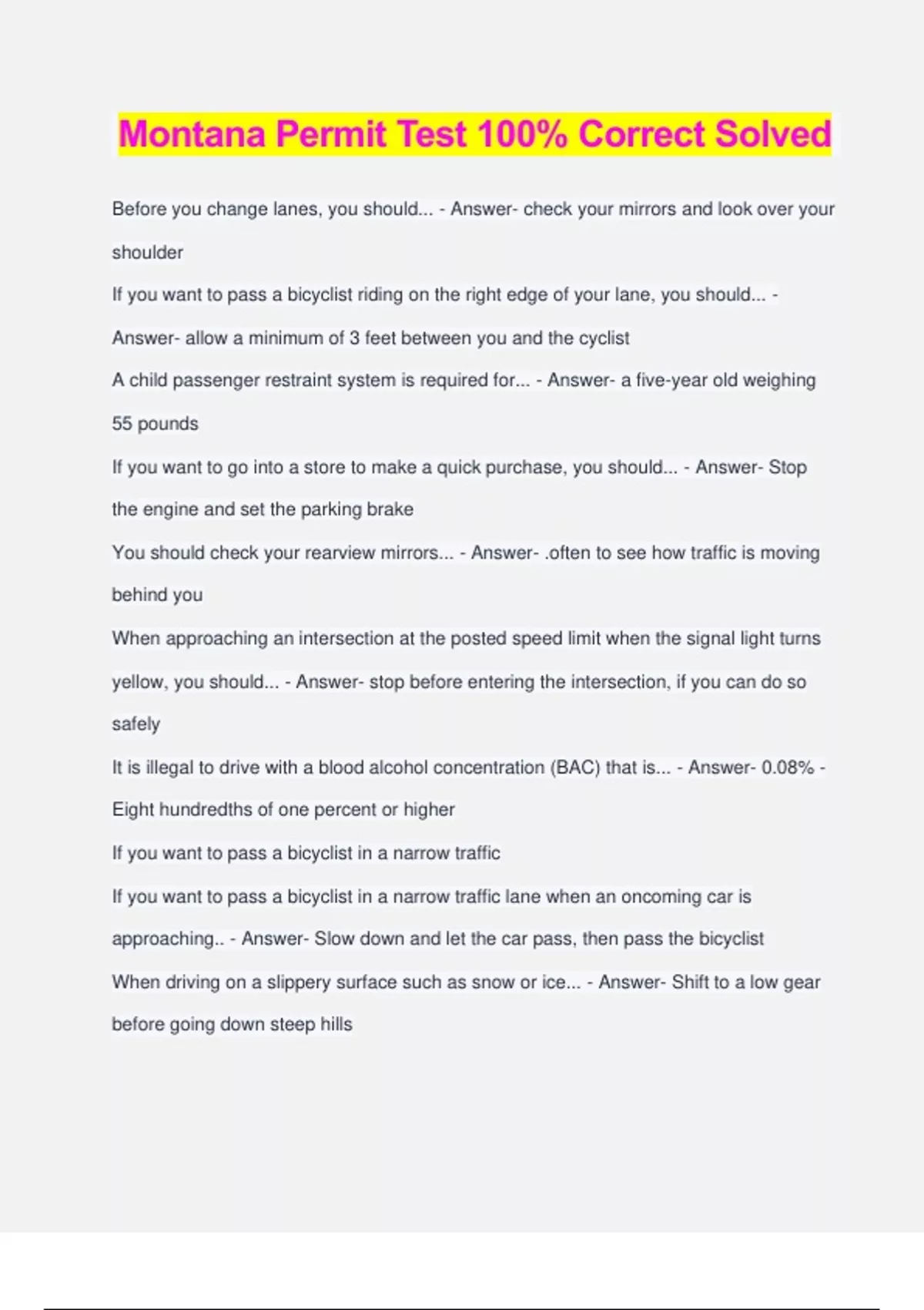 Montana Permit Test 100% Correct Solved Before you change lanes, you should... - Answer- check your mirrors and look over your shoulder If you want to pass a bicyclist riding on the right edge of your lane, you should... - Answer- allow a minimum of 3 feet between you and the cyclist A child passenger restraint system is required for... - Answer- a five-year old weighing 55 pounds If you want to go into a store to make a quick purchase, you should... - Answer- Stop the engine and set the parking brake You should check your rearview mirrors... - Answer- .often to see how traffic is moving behind you When approaching an intersection at the posted speed limit when the signal light turns yellow, you should... - Answer- stop before entering the intersection, if you can do so safely It is illegal to drive with a blood alcohol concentration (BAC) that is... - Answer- 0.08% - Eight hundredths of one percent or higher If you want to pass a bicyclist in a narrow traffic If you want to pass a bicyclist in a narrow traffic lane when an oncoming car is approaching.. - Answer- Slow down and let the car pass, then pass the bicyclist When driving on a slippery surface such as snow or ice... - Answer- Shift to a low gear before going down steep hills If you are driving on a two-way street and you want to turn left at an upcoming corner, give the right-of-way to... - Answer- Vehicles coming towards you When you see a vehicle stopped on the right shoulder of the road ahead with its hazard lights on, - Answer- slow down and pass very carefully Vehicles displaying a diamond-shaped sign... - Answer- must stop before crossing railroad tracks You must notify DMV within 5 days if you... - Answer- sell or transfer your vehicle It helps to improve traffic flow if you... - Answer- do not slow down to look at an accident scene Bridges freeze - Answer- when first wet It is a proper use of vehicle lights to use low beams - Answer- during the day on narrow country roads If you were parked and have been waiting a long time in heavy traffic with your turn signal on to re-enter traffic.. - Answer- continue waiting and yielding to traffic in the lane Allow extra space in front of your vehicle... - Answer- when following a motorcycle It is legal to drive with an open alcoholic beverage container if the container is.. - Answer- .in the trunk You must show proof of insurance to law enforcement - Answer- if you are involved in an accident or stopped for a citation If there is a double solid yellow line dividing opposite lanes of traffic, you may - Answer- cross over the lines to make a left turn from or into a side street or driveway It is a safe driving practice to check - Answer- your rearview mirrors frequently