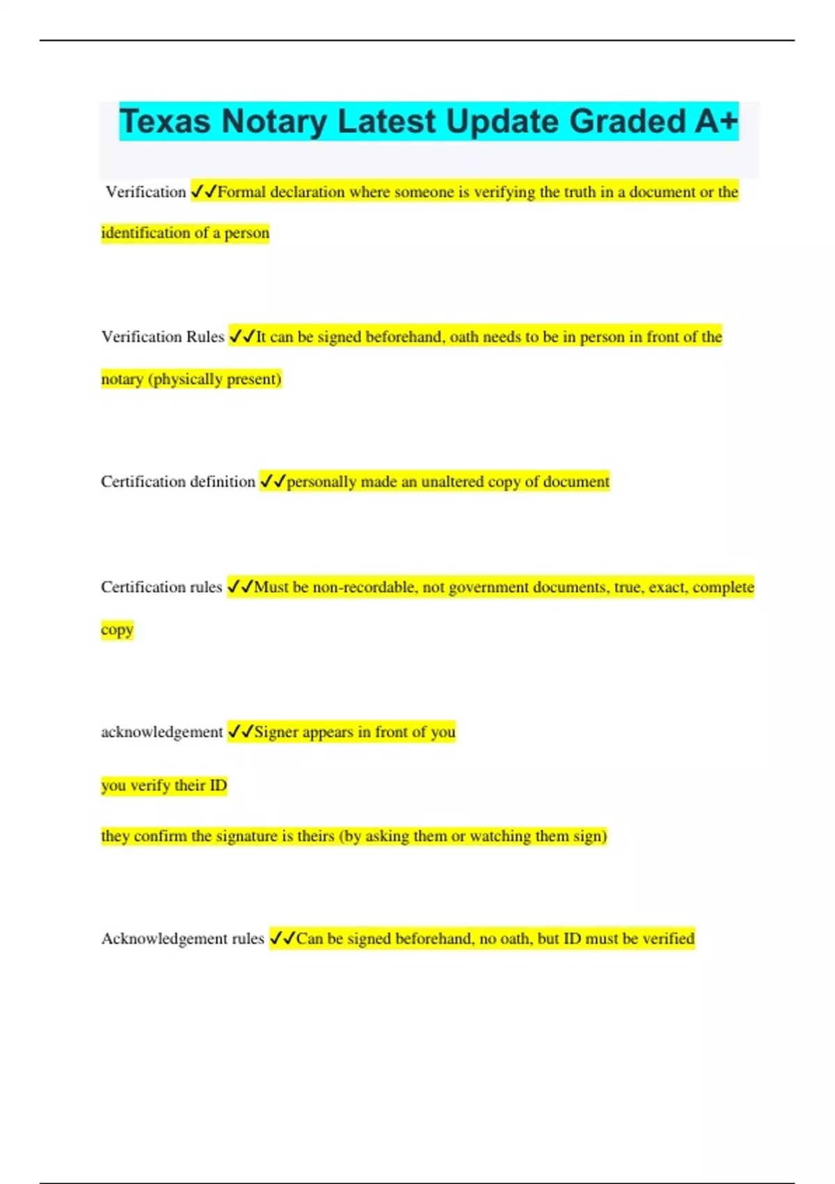 Texas Notary Latest Update Graded A+ Verification Formal declaration where someone is verifying the truth in a document or the identification of a person Verification Rules It can be signed beforehand, oath needs to be in person in front of the notary (physically present) Certification definition personally made an unaltered copy of document Certification rules Must be non-recordable, not government documents, true, exact, complete copy acknowledgement Signer appears in front of you you verify their ID they confirm the signature is theirs (by asking them or watching them sign) Acknowledgement rules Can be signed beforehand, no oath, but ID must be verified Jurat Adds to affidavit, clarifies when/where/and with whom an affidavit was made Jurat rules must be under oath in front of notary when signing Notarization process Personal appearance with ID, personally knowing, credible witness personally knowing Notarial certificate Required for each notarial act... cannot sign/seal if certificate is missing Grantee someone receiving