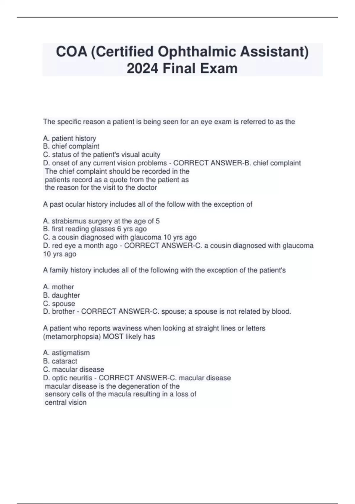 COA (Certified Ophthalmic Assistant) 2024 Final Exam The specific reason a patient is being seen for an eye exam is referred to as the A. patient history B. chief complaint C. status of the patient's visual acuity D. onset of any current vision problems - CORRECT ANSWER-B. chief complaint The chief complaint should be recorded in the patients record as a quote from the patient as the reason for the visit to the doctor A past ocular history includes all of the follow with the exception of A. strabismus surgery at the age of 5 B. first reading glasses 6 yrs ago C. a cousin diagnosed with glaucoma 10 yrs ago D. red eye a month ago - CORRECT ANSWER-C. a cousin diagnosed with glaucoma 10 yrs ago A family history includes all of the following with the exception of the patient's A. mother B. daughter C. spouse D. brother - CORRECT ANSWER-C. spouse; a spouse is not related by blood. A patient who reports waviness when looking at straight lines or letters (metamorphopsia) MOST likely has A. astigmatism B. cataract C. macular disease D. optic neuritis - CORRECT ANSWER-C. macular disease macular disease is the degeneration of the sensory cells of the macula resulting in a loss of central vision A patient calls the office giving the history that they had cataract surgery 2 yrs ago. For the past 2 days he has noticed flashes of light in the operated eye. A. Patient should call back to see an ophthalmologist if the symptoms persist B. Patient should be assured that "flashes of light" is a normal occurrence in aphakic surgery C. Patient should see an ophthalmologist within 24 hours D. Patient should see an ophthalmologist within one month - CORRECT ANSWER-C. Patient should see an ophthalmologist w/i 24hr Flashes of light coming across a field of vision often is a forerunner of a retinal detachment; therefore the patient with this symptom should be seen promptly