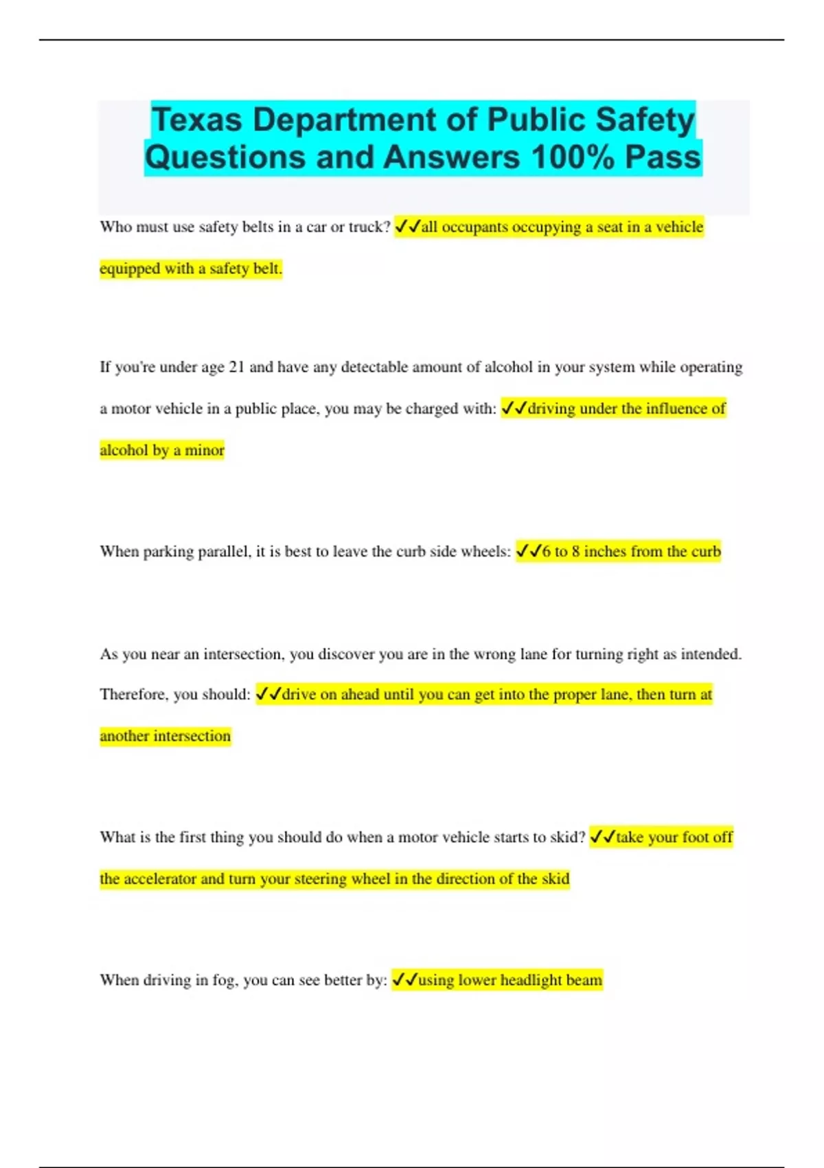 Texas Department of Public Safety Questions and Answers 100% Pass Who must use safety belts in a car or truck? all occupants occupying a seat in a vehicle equipped with a safety belt. If you're under age 21 and have any detectable amount of alcohol in your system while operating a motor vehicle in a public place, you may be charged with: driving under the influence of alcohol by a minor When parking parallel, it is best to leave the curb side wheels: 6 to 8 inches from the curb As you near an intersection, you discover you are in the wrong lane for turning right as intended. Therefore, you should: drive on ahead until you can get into the proper lane, then turn at another intersection What is the first thing you should do when a motor vehicle starts to skid? take your foot off the accelerator and turn your steering wheel in the direction of the skid When driving in fog, you can see better by: using lower headlight beam Under favorable circumstances, including reaction time, a motor vehicle with good brakes going 50 miles per hour can be stopped within: about 229 You must always stop when: a traffic officer instructs you to stop When making a long trip, you should stop for a rest: about every 2 hours or 100 miles Your driver license and driving privilege would be automatically suspended if you were convicted of: displaying or possessing a fake or altered driver license or ID card Marijuana use will: adversely affect a driver's concentration, judgment, and perceptual skills The most a person (age 21 or older) can be fined for a first conviction of driving while under the influence of intoxicating liquor with no death or injury involved is: $2,000 Child pass anger safety seats are required for all children under the age of: 8 years or less than 4 feet 9 inches in height (regardless of age) After overtaking another motor vehicle on a two-lane road, you can best judge when it is safe to drive back into the right hand lane by: waiting until you can see the overtaken vehicle in your rearview mirror If blinded by an approaching motor vehicle, it is best to: slow down and avoid looking directly into the headlights of the approaching vehicle Your driver license may be suspended for: repeated violations of traffic laws When you hear a siren, bell, or see a flashing red light coming towards you, from any direction, you should: yield the right-of-way to the emergency vehicle If a person under the age of 21 refuses to provide a breath or blood specimen to a police officer, their driver license or driving privilege will be suspended for a first time refusal for: 60 days If you have crash and someone is injured, you should: carefully help anyone who might be hurt and send for skilled help as quickly as possible