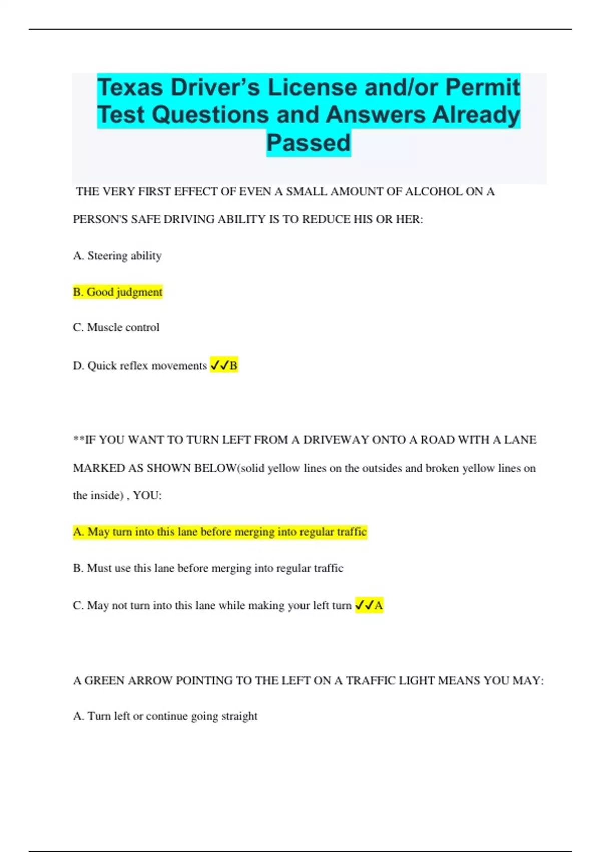 Texas Driver’s License and/or Permit Test Questions and Answers Already Passed THE VERY FIRST EFFECT OF EVEN A SMALL AMOUNT OF ALCOHOL ON A PERSON'S SAFE DRIVING ABILITY IS TO REDUCE HIS OR HER: A. Steering ability B. Good judgment C. Muscle control D. Quick reflex movements B **IF YOU WANT TO TURN LEFT FROM A DRIVEWAY ONTO A ROAD WITH A LANE MARKED AS SHOWN BELOW(solid yellow lines on the outsides and broken yellow lines on the inside) , YOU: A. May turn into this lane before merging into regular traffic B. Must use this lane before merging into regular traffic C. May not turn into this lane while making your left turn A A GREEN ARROW POINTING TO THE LEFT ON A TRAFFIC LIGHT MEANS YOU MAY: A. Turn left or continue going straight B. Turn in that direction only after you stop C. Make a protected turn in that direction C U-TURNS IN BUSINESS DISTRICTS ARE: A. Always illegal because they are dangerous B. Legal if the businesses are churches, apartments, or clubs C. Legal at intersections, unless a sign prohibits them C BEFORE DRIVING INTO AN INTERSECTION AFTER A STOP, YOU SHOULD LOOK: A. Straight ahead and to the left B. Left and right only C. Left, right, and then left again C TWO SETS OF SOLID DOUBLE YELLOW LINES TWO FEET OR MORE APART: A. May only be crossed to enter a private driveway B. Should be treated like a solid wall and not be crossed C. Denote a lane for beginning or ending left-hand turns B **AN ORANGE AND RED SIGN OF THIS SHAPE (triangle) MEANS: A. Roadwork ahead B. Vehicle has the right-of-way C. Slow-moving vehicle C WHEN WAITING TO MAKE A LEFT TURN, YOU SHOULD GIVE THE RIGHT-OF-WAY TO VEHICLES COMING FROM THE OPPOSITE DIRECTION: A. Until at least two vehicles have passed B. Until dangerously close cars have passed C. Until all of the cars have passed B DRIVING UNDER THE INFLUENCE OF A DRUG THAT MAKES YOUR DRIVING UNSAFE IS PERMITTED: A. If it is not an illegal drug B. If it is a prescription drug C. Under no circumstances C **YOU WANT TO TURN LEFT AHEAD. IN THE MIDDLE OF THE ROAD THERE IS A LANE MARKED AS SHOWN (solid yellow lines on the outsides and broken yellow lines on the inside) YOU MUST: A. Turn from your current traffic lane after signaling B. Not enter this lane for any reason C. Merge completely into this lane before you make your left turn C USE YOUR HEADLIGHTS ON RAINY, SNOWY, OR FOGGY DAYS: A. On the high-beam setting B. So other drivers can see you C. To warn others of bad conditions B