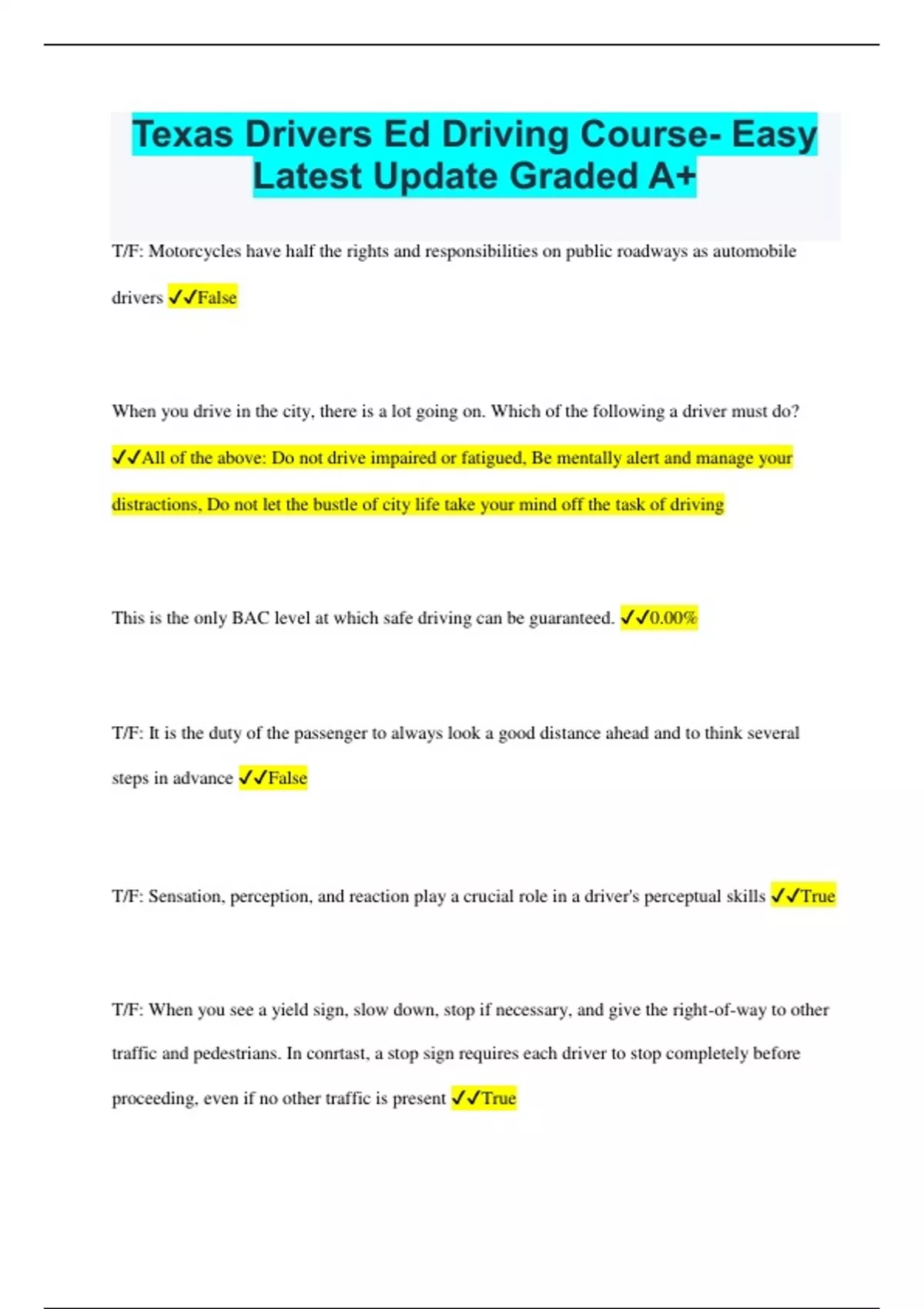 Texas Drivers Ed Driving Course- Easy Latest Update Graded A+