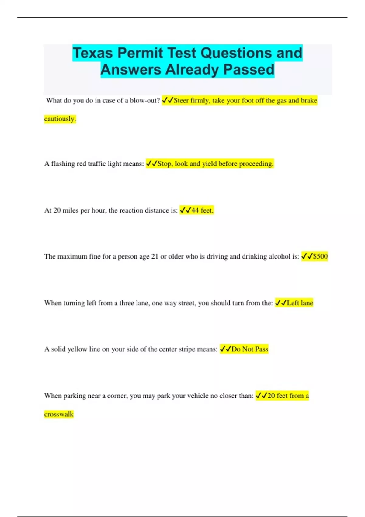 Texas Permit Test Questions and Answers Already Passed What do you do in case of a blow-out? Steer firmly, take your foot off the gas and brake cautiously. A flashing red traffic light means: Stop, look and yield before proceeding. At 20 miles per hour, the reaction distance is: 44 feet. The maximum fine for a person age 21 or older who is driving and drinking alcohol is: $500 When turning left from a three lane, one way street, you should turn from the: Left lane A solid yellow line on your side of the center stripe means: Do Not Pass When parking near a corner, you may park your vehicle no closer than: 20 feet from a crosswalk If you are being passed, you should: Keep in your lane You must always stop when: A traffic officer tells you to. When you hear a siren coming, you should: Yield to the emergency vehicle. If you are teaching a beginner to drive, you must: Be a licensed driver age 21 years or older. You must give a signal either by hand and arm or by signal device: Anytime you change lanes. If a child ran into the road 60-65 feet ahead of your vehicle, what is the highest speed from which you could stop before hitting him? 20 mph The headlights must be turned on: 30 minutes after sunset. A vehicle should never be parked closer to a fire plug than: 15 feet. A flashing yellow signal light means: Always slow down. When you are taking medicine prescribed for you by a doctor you should: Ask your doctor if it is safe to drive. You may lawfully allow an object to extend beyond the left side of your vehicle: 3 inches. Vehicle skids are most likely to be caused by: Driving too fast on slippery roads. If you are involved in an injury accident in the city, you must notify: The local police. The maximum daytime speed limit for passenger cars on a numbered highway is: 70 mph At night, a driver should dim his headlights when an oncoming car comes within: 500 feet. Child passenger safety seats are required for all children under the age of: 5 years old; or under 36 inches (no matter what age) When making a long trip you should stop for a rest: Every 2 hours or 100 miles A posted speed limit of 55 mph means: You may drive 55 mph only under favorable conditions. If you run off the pavement you should: Steer straight ahead, slow down and gradually return to the pavement. Your driver's license will automatically be suspended for: Possessing a fake driver's license. Alcohol affects a driver by: Slowing down