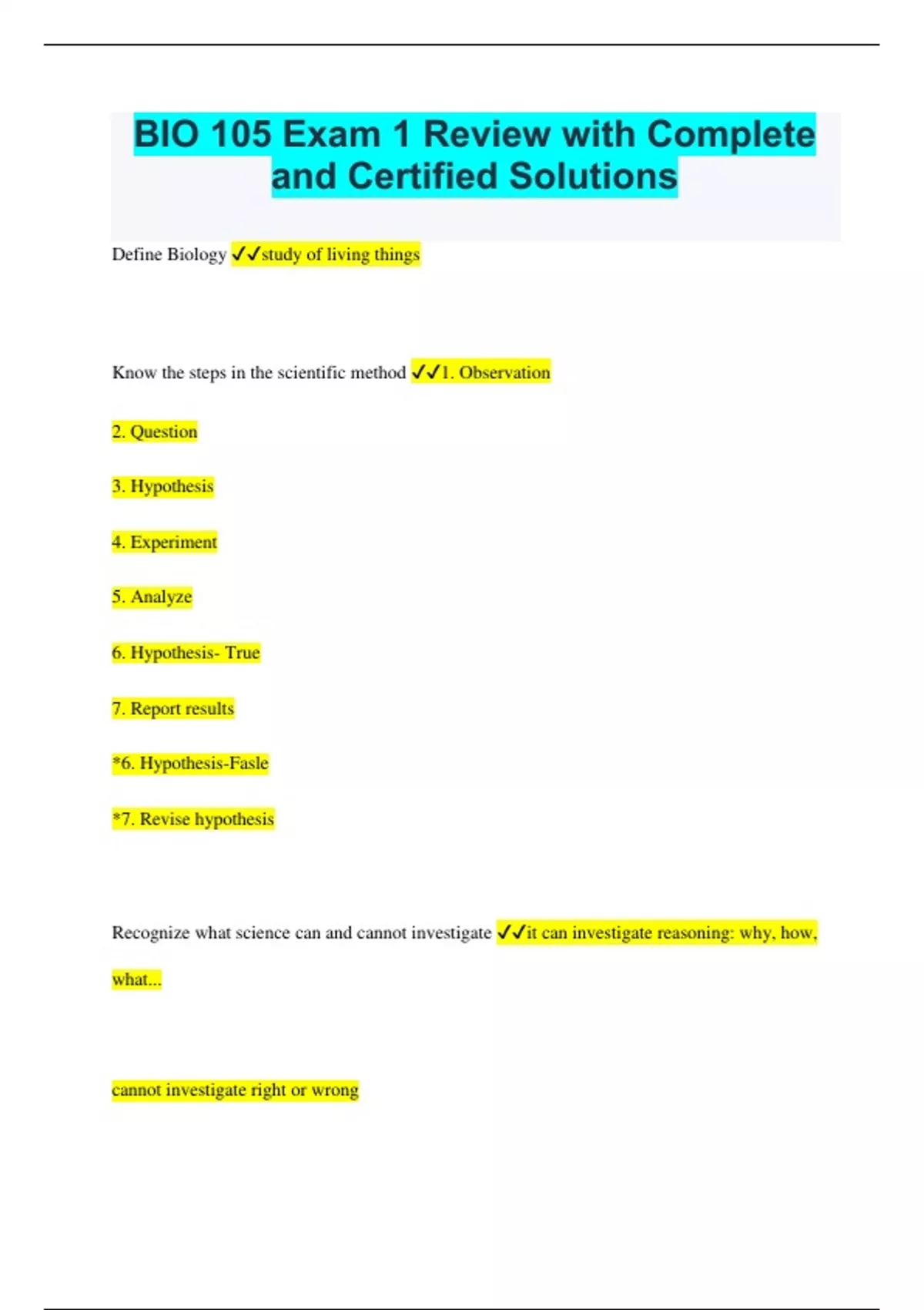 BIO 105 Exam 1 Review with Complete and Certified Solutions Define Biology study of living things Know the steps in the scientific method 1. Observation 2. Question 3. Hypothesis 4. Experiment 5. Analyze 6. Hypothesis- True 7. Report results *6. Hypothesis-Fasle *7. Revise hypothesis Recognize what science can and cannot investigate it can investigate reasoning: why, how, what... cannot investigate right or wrong What special aspect determines an element's properties number of protons and neutrons Know how to determine the number of protons, electrons, and neutrons in an element by its entry in the periodic table Atomic # (top)- protons Atomic mass (bottom)- sum of protons & neutrons Period (columns)- # of shells (2 in first, up to 8 in others) Group (rows)- # of electrons in outer shell Know what an isotope is atoms of the same element that diiffer in number of neutrons Know the 4 major and 4 trace elements important to life Carbon, oxygen, hydrogen, nitrogen Calcium, phosphorus, potassium, sulfur Know what a valence is outer shell Know the properties of covalent bonds when 2 atoms share electrons in order to have a completed outer shell How they form (covalent) atoms sharing valence shell electrons to balance The different kinds there are (covalent) single, double, triple Know the example of a triple bond (Triyne) and what it does share 3 electrons in outer shells Know what a polar covalent bond is one