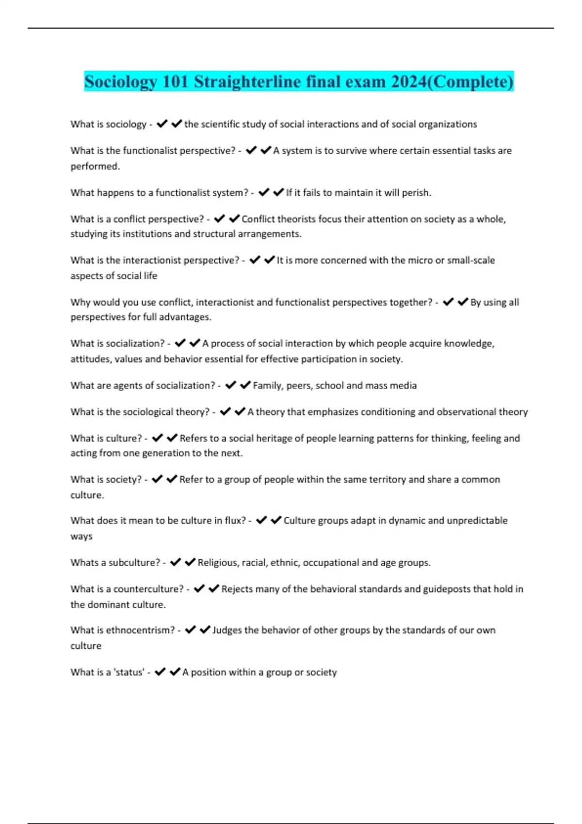 ociology 101 Straighterline final exam 2024(Complete) What is sociology - the scientific study of social interactions and of social organizations What is the functionalist perspective? - A system is to survive where certain essential tasks are performed. What happens to a functionalist system? - If it fails to maintain it will perish. What is a conflict perspective? - Conflict theorists focus their attention on society as a whole, studying its institutions and structural arrangements. What is the interactionist perspective? - It is more concerned with the micro or small-scale aspects of social life Why would you use conflict, interactionist and functionalist perspectives together? - By using all perspectives for full advantages. What is socialization? - A process of social interaction by which people acquire knowledge, attitudes, values and behavior essential for effective participation in society. What are agents of socialization? - Family, peers, school and mass media What is the sociological theory? - A theory that emphasizes conditioning and observational theory What is culture? - Refers to a social heritage of people learning patterns for thinking, feeling and acting from one generation to the next. What is society? - Refer to a group of people within the same territory and share a common culture. What does it mean to be culture in flux? - Culture groups adapt in dynamic and unpredictable ways Whats a subculture? - Religious, racial, ethnic, occupational and age groups. What is a counterculture? - Rejects many of the behavioral standards and guideposts that hold in the dominant culture.