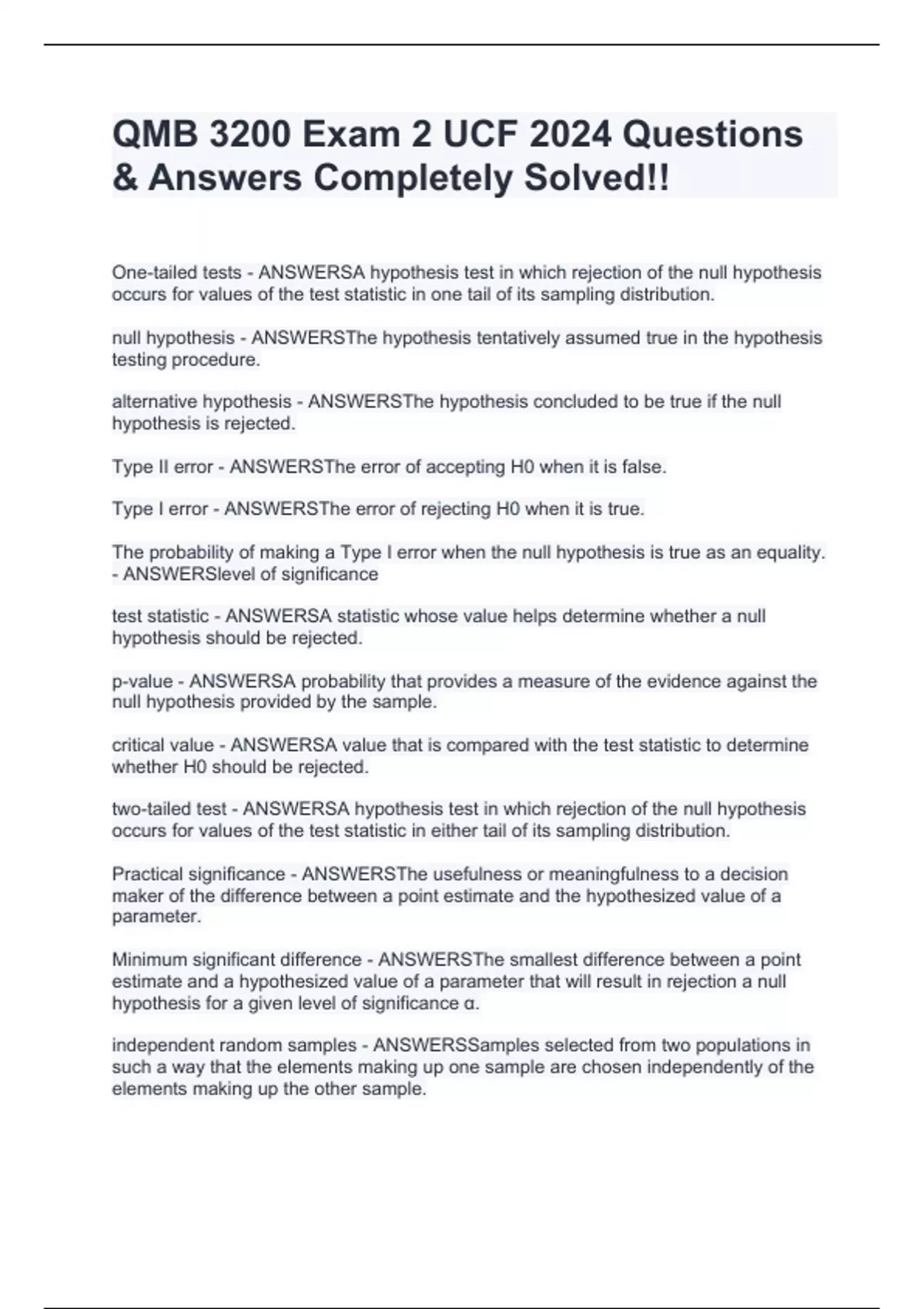 QMB 3200 Exam 2 UCF 2024 Questions & Answers Completely Solved!!