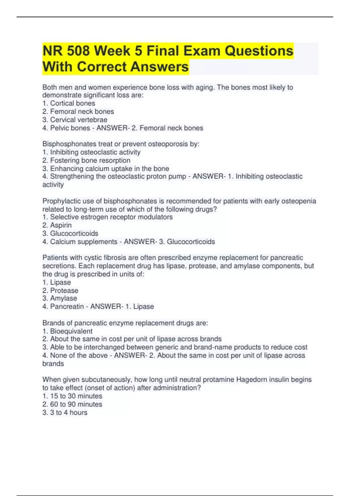 NR 508 Week 5 Final Exam Questions With Correct Answers Both men and women experience bone loss with aging. The bones most likely to demonstrate significant loss are: 1. Cortical bones 2. Femoral neck bones 3. Cervical vertebrae 4. Pelvic bones - ANSWER- 2. Femoral neck bones Bisphosphonates treat or prevent osteoporosis by: 1. Inhibiting osteoclastic activity 2. Fostering bone resorption 3. Enhancing calcium uptake in the bone 4. Strengthening the osteoclastic proton pump - ANSWER- 1. Inhibiting osteoclastic activity Prophylactic use of bisphosphonates is recommended for patients with early osteopenia related to long-term use of which of the following drugs? 1. Selective estrogen receptor modulators 2. Aspirin 3. Glucocorticoids 4. Calcium supplements - ANSWER- 3. Glucocorticoids Patients with cystic fibrosis are often prescribed enzyme replacement for pancreatic secretions. Each replacement drug has lipase, protease, and amylase components, but the drug is prescribed in units of: 1. Lipase 2. Protease 3. Amylase 4. Pancreatin - ANSWER- 1. Lipase Brands of pancreatic enzyme replacement drugs are: 1. Bioequivalent 2. About the same in cost per unit of lipase across brands 3. Able to be interchanged between generic and brand-name products to reduce cost 4. None of the above - ANSWER- 2. About the same in cost per unit of lipase across brands When given subcutaneously, how long until neutral protamine Hagedorn insulin begins to take effect (onset of action) after administration? 1. 15 to 30 minutes 2. 60 to 90 minutes 3. 3 to 4 hours 4. 6 to 8 hours - ANSWER- 2. 60 to 90 minutes Hypoglycemia can result from the action of either insulin or an oral hypoglycemic. Signs and symptoms of hypoglycemia include: 1. "Fruity" breath odor and rapid respiration 2. Diarrhea, abdominal pain, weight loss, and hypertension 3. Dizziness, confusion, diaphoresis, and tachycardia 4. Easy bruising, palpitations, cardiac dysrhythmias, and coma - ANSWER- 3. Dizziness, confusion, diaphoresis, and tachycardia Nonselective beta blockers and alcohol create serious drug interactions with insulin because they: 1. Increase blood glucose levels 2. Produce unexplained diaphoresis 3. Interfere with the ability of the body to metabolize glucose 4. Mask the signs and symptoms of altered glucose levels - ANSWER- 4. Mask the signs and symptoms of altered glucose levels Lispro is an insulin analogue produced by recombinant DNA technology. Which of the following statements about this form of insulin is NOT true? 1. Optimal time of preprandial injection is 15 minutes. 2. Duration of action is increased when the dose is increased. 3. It is compatible with neutral protamine Hagedorn insulin. 4. It has no pronounced peak. - ANSWER- 2. Duration of action is increased when the dose is increased. The decision may be made to switch from twice daily neutral protamine Hagedorn (NPH) insulin to insulin glargine to improve glycemia control throughout the day. If this is done: 1. The initial dose of glargine is reduced by 20% to avoid hypoglycemia. 2. The initial dose of glargine is 2 to 10 units per day. 3. Patients who have been on high doses of NPH will need tests for insulin antibodies. 4. Obese patients may require more than 100 units per day. - ANSWER- 1. The initial dose of glargine is reduced by 20% to avoid hypoglycemia. When blood glucose levels are difficult to control in type 2 diabetes some form of insulin may be added to the treatment regimen to control blood glucose and limit complication risks. Which of the following statements is accurate based on research? 1. Premixed insulin analogues are better at lowering HbA1C and have less risk for hypoglycemia. 2. Premixed insulin analogues and the newer premixed insulins are associated with more weight gain than the oral antidiabetic agents. 3. Newer premixed insulins are better at lowering HbA1C and postprandial glucose levels than long-acting insulins. 4. Patients who are not controlled on oral agents and have postprandial hyperglycemia can have neutral protamine Hagedorn insulin added at bedtime. - ANSWER- 3. Newer premixed insulins are better at lowering HbA1C and postprandial glucose levels than long-acting insulins. Metformin is a primary choice of drug to treat hyperglycemia in type 2 diabetes because it: 1. Substitutes for insulin usually secreted by the pancreas 2. Decreases glycogenolysis by the liver 3. Increases the release of insulin from beta cells 4. Decreases peripheral glucose utilization - ANSWER- 2. Decreases glycogenolysis by the liver Prior to prescribing metformin, the provider should: 1. Draw a serum creatinine to assess renal function 2. Try the patient on insulin 3. Tell the patient to increase iodine intake 4. Have the patient stop taking any sulfonylurea to avoid dangerous drug interactions - ANSWER- 1. Draw a serum creatinine to assess renal function The action of "gliptins" is different from other antidiabetic agents because they: 1. Have a low risk for hypoglycemia 2. Are not associated with weight gain 3. Close ATP-dependent potassium channels in the beta cell 4. Act on the incretin system to indirectly increase insulin production - ANSWER- 4. Act on the incretin system to indirectly increase insulin production Sitagliptin has been approved for: 1. Monotherapy in once-daily doses 2. Combination therapy with metformin 3. Both 1 and 2 4. Neither 1 nor 2 - ANSWER- 3. Both 1 and 2 GLP-1 agonists: 1. Directly bind to a receptor in the pancreatic beta cell 2. Have been approved for monotherapy 3. Speed gastric emptying to decrease appetite 4. Can be given orally once daily - ANSWER- 1. Directly bind to a receptor in the pancreatic beta cell Avoid concurrent administration of exenatide with which of the following drugs? 1. Digoxin 2. Warfarin 3. Lovastatin 4. All of the above - ANSWER- 4. All of the above Administration of exenatide is by subcutaneous injection: 1. 30 minutes prior to the morning meal 2. 60 minutes prior to the morning and evening meal 3. 15 m