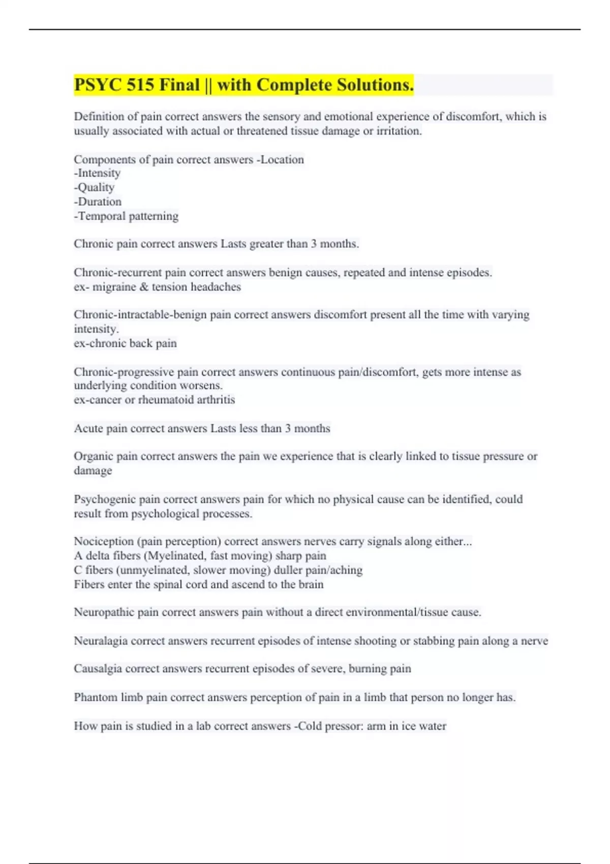 Definition of pain correct answers the sensory and emotional experience of discomfort, which is usually associated with actual or threatened tissue damage or irritation. Components of pain correct answers -Location -Intensity -Quality -Duration -Temporal patterning Chronic pain correct answers Lasts greater than 3 months. Chronic-recurrent pain correct answers benign causes, repeated and intense episodes. ex- migraine & tension headaches Chronic-intractable-benign pain correct answers discomfort present all the time with varying intensity. ex-chronic back pain Chronic-progressive pain correct answers continuous pain/discomfort, gets more intense as underlying condition worsens. ex-cancer or rheumatoid arthritis Acute pain correct answers Lasts less than 3 months Organic pain correct answers the pain we experience that is clearly linked to tissue pressure or damage Psychogenic pain correct answers pain for which no physical cause can be identified, could result from psychological processes. Nociception (pain perception) correct answers nerves carry signals along either... A delta fibers (Myelinated, fast moving) sharp pain C fibers (unmyelinated, slower moving) duller pain/aching Fibers enter the spinal cord and ascend to the brain Neuropathic pain correct answers pain without a direct environmental/tissue cause. Neuralagia correct answers recurrent episodes of intense shooting or stabbing pain along a nerve Causalgia correct answers recurrent episodes of severe, burning pain Phantom limb pain correct answers perception of pain in a limb that person no longer has. How pain is studied in a lab correct answers -Cold pressor: arm in ice water