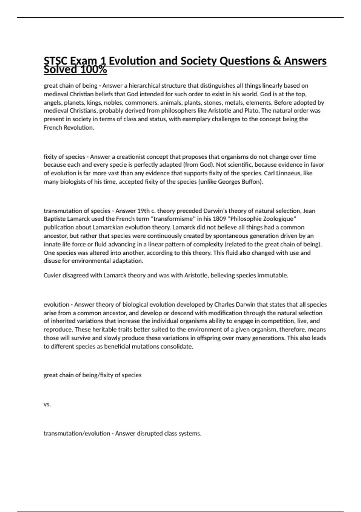 STSC Exam 1 Evolution and Society Questions & Answers Solved 100%