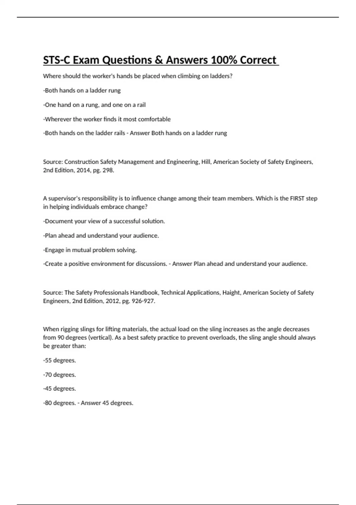 Where should the worker's hands be placed when climbing on ladders? -Both hands on a ladder rung -One hand on a rung, and one on a rail -Wherever the worker finds it most comfortable -Both hands on the ladder rails - Answer Both hands on a ladder rung Source: Construction Safety Management and Engineering, Hill, American Society of Safety Engineers, 2nd Edition, 2014, pg. 298. A supervisor's responsibility is to influence change among their team members. Which is the FIRST step in helping individuals embrace change? -Document your view of a successful solution. -Plan ahead and understand your audience. -Engage in mutual problem solving. -Create a positive environment for discussions. - Answer Plan ahead and understand your audience. Source: The Safety Professionals Handbook, Technical Applications, Haight, American Society of Safety Engineers, 2nd Edition, 2012, pg. 926-927. When rigging slings for lifting materials, the actual load on the sling increases as the angle decreases from 90 degrees (vertical). As a best safety practice to prevent overloads, the sling angle should always be greater than: -55 degrees. -70 degrees. -45 degrees. -80 degrees. - Answer 45 degrees. Source: Handbook of Rigging, MacDonald, Rossnagel, McGraw Hill, 5th Edition, 2009, pg. 230. A behavioral approach to safety focuses on consequences as an important motivator for future safe behaviors. Consequences can be described by their timing, consistency, and significance. The MOST powerful consequences are: -Delayed, uncertain, positive. -Soon, uncertain, positive. -Soon, certain, negative. -Soon, certain, positive. - Answer Soon, certain, positive. Source: The Behavior-Based Safety Process, Krause, Van Nostrand Reinhold, 2nd Edition, pg. 38. When electric current passes through the body, the result can range from a mild tingling to immediate cardiac arrest. The magnitude of the effect is determined by the amount of current flowing through the body, the path of current through the body, and: -The voltage applied to the circuit. -The age and physical condition of the worker. -The length of time the body remains in the circuit. -The relative humidity of the work setting. - Answer The length of time the body remains in the circuit. Source: Construction Safety Management and Engineering, Hill, American Society of Safety Engineers, 2nd Edition, 2014, pg. 428. A chemical cartridge respirator is an example of which type of respiratory protective device? -Air purifying respirator -Rescue respirator -Air supplying respirator -One designed for use in oxygen deficient environments - Answer Air purifying respirator Source: The Safety Professionals Handbook, Technical Applications, Haight, American Society of Safety Engineers, 2nd Edition, 2012, pg. 884. Which is the recommended safety factor (the ratio between its breaking strength and safe working load) for BEST condition (new) fiber ropes? -8:1 -4:1 -6:1 -12:1 - Answer 4:1 Source: Handbook of Rigging, MacDonald, Rossnagel, McGraw Hill, 5th Edition, 2009, pg. 180. A key element of effective communication between a supervisor and subordinate is to: -Speak with authority. -Use short, concise statements. -Create a shared understanding. -Document all verbal communications. - Answer Create a shared understanding. Source: Supervisors' Safety Manual, Crittenden (Editor), National Safety Council, 10th Edition, 2009, pg. 28. When MUST an employer disclose chemical identifying information that they consider a trade secret? -To a healthcare professional when needed to treat a medical emergency -To a public safety officer upon request -To colleagues of injured or ill employees -To a regulatory authority following a verbal request - Answer To a healthcare professional when needed to treat a medical emergency. Source: Accident Prevention Manual for Business and Industry: Administration and Programs; Hagan, Montgomery, O'Reilly. National Safety Council, 13th Edition, 2009, pg. 85. Forklifts equipped with approved cages are sometimes used to lift workers for elevated work. Which is a best safety practice for such situations? -No more than a single worker may occupy the cage at any one time. -It is only acceptable to transport workers across the job site while they are in the cage if the ground is firm and level. -Once at elevation, the lifeline should be detached from the cage and reconnected to a structural building component. -Workers should be securely attached to the cage with a lifeline and full body harness. - Answer Workers should be securely attached to the cage with a lifeline and full body harness. Source:Fall Protection and Scaffolding Safety, Gagnet, Government Institutes, 2000, pg. 158-159. As the site safety supervisor, you have been instructed to create and train a fire brigade to minimize property damage from unexpected fire incidents. You have decided that the fire brigade will only be responsible to fight small fires that can be controlled with portable fire extinguishers without the need for protective clothing or breathing apparatus. Which is this type of fire brigade called? -Structural fire brigade -First response brigade team -Incipient stage fire brigade -Interior fire brigade - Answer Incipient stage fire brigade. Source: Supervisors' Safety Manual, Crittenden (Editor), National Safety Council, 10th Edition, 2009, pg. 549. Employees that pour or finish wet concrete without personal protective equipment can be exposed to hand injuries because wet concrete: -Has abrasive properties. -May conceal sharp edges of embedded rebar. -Becomes very hot as it cures. -Has caustic chemical properties. - Answer Has caustic chemical properties. Source: Construction Safety Management and Engineering, Hill, American Society of Safety Engineers, 2nd Edition, 2014, pg. 565. Which jobs represent the highest priority for a formal job safety analysis (JSA)? -Jobs that are performed by the largest number of employees -New jobs or tasks that are being completed for the very first time -Simple