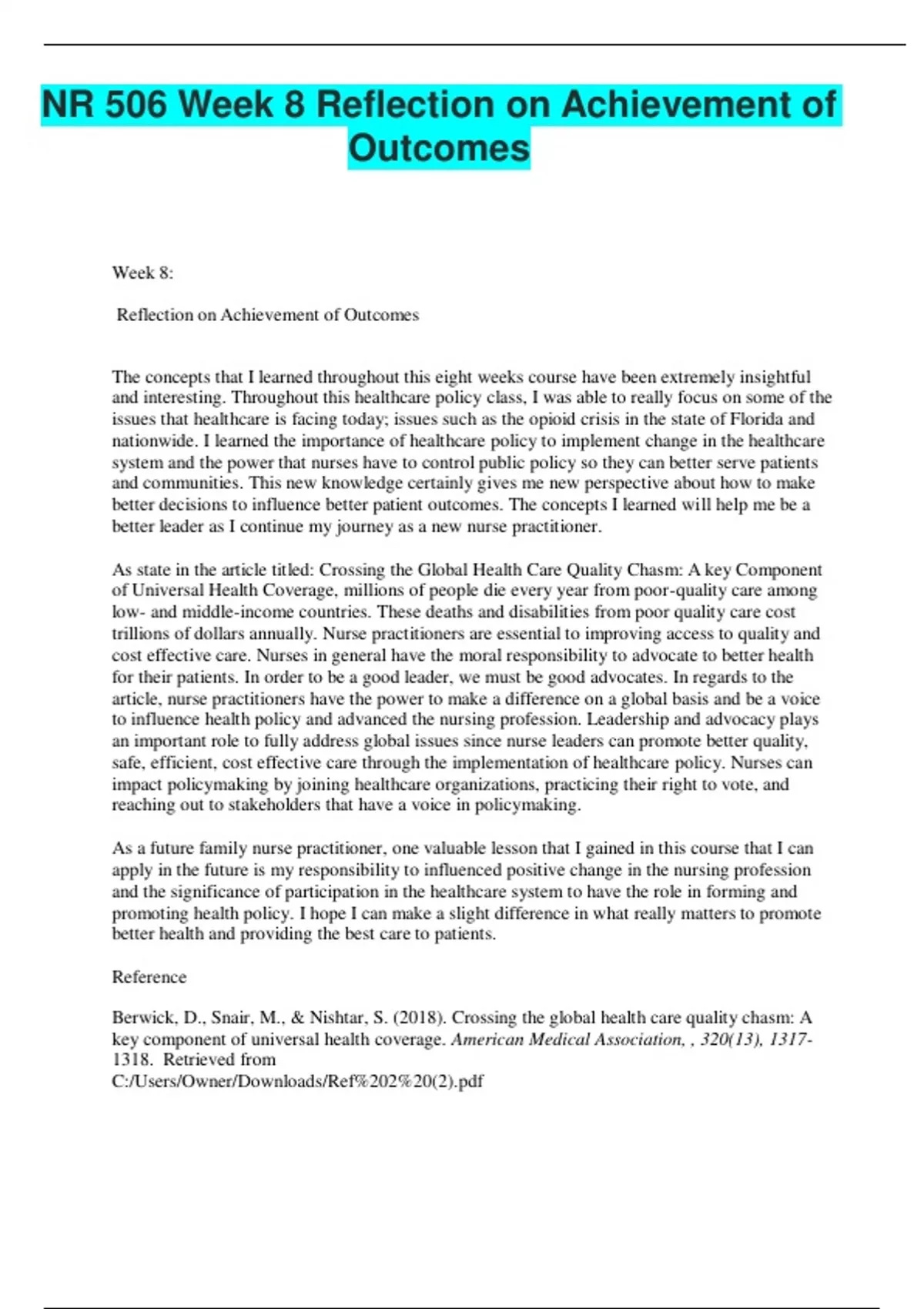 NR 506 Week 8 Reflection on Achievement of Outcomes (GRADED A)