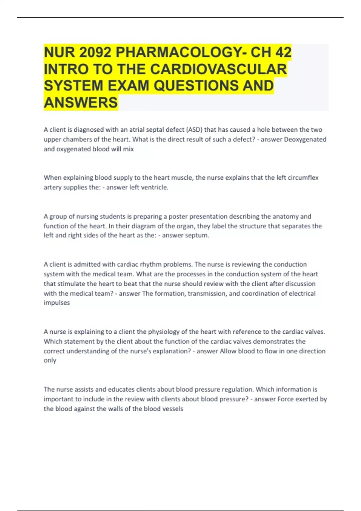 NUR 2092 PHARMACOLOGY- CH 42 INTRO TO THE CARDIOVASCULAR SYSTEM-47 QUESTIONS AND ANSWERS