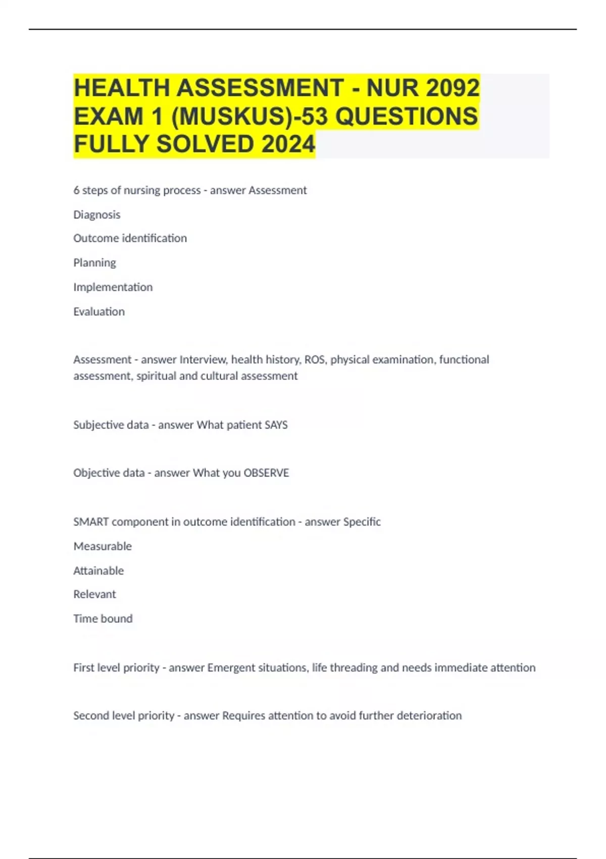 HEALTH ASSESSMENT - NUR 2092 EXAM 1 (MUSKUS)-53 QUESTIONS FULLY SOLVED 2024