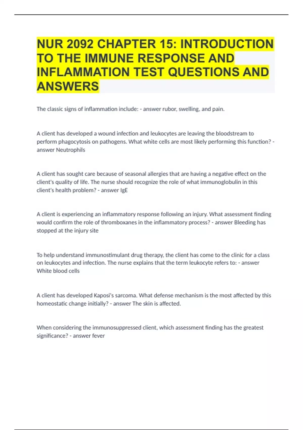 NUR 2092 CHAPTER 15 INTRODUCTION TO THE IMMUNE RESPONSE AND INFLAMMATION TEST