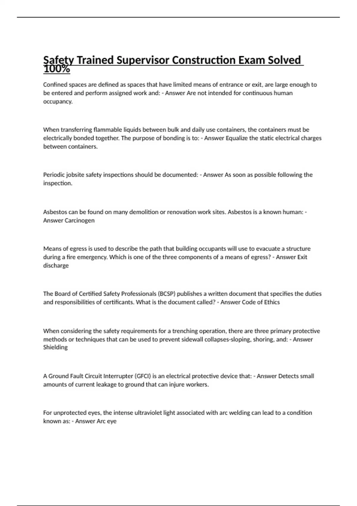 Confined spaces are defined as spaces that have limited means of entrance or exit, are large enough to be entered and perform assigned work and: - Answer Are not intended for continuous human occupancy. When transferring flammable liquids between bulk and daily use containers, the containers must be electrically bonded together. The purpose of bonding is to: - Answer Equalize the static electrical charges between containers. Periodic jobsite safety inspections should be documented: - Answer As soon as possible following the inspection. Asbestos can be found on many demolition or renovation work sites. Asbestos is a known human: - Answer Carcinogen Means of egress is used to describe the path that building occupants will use to evacuate a structure during a fire emergency. Which is one of the three components of a means of egress? - Answer Exit discharge The Board of Certified Safety Professionals (BCSP) publishes a written document that specifies the duties and responsibilities of certificants. What is the document called? - Answer Code of Ethics When considering the safety requirements for a trenching operation, there are three primary protective methods or techniques that can be used to prevent sidewall collapses-sloping, shoring, and: - Answer Shielding A Ground Fault Circuit Interrupter (GFCI) is an electrical protective device that: - Answer Detects small amounts of current leakage to ground that can injure workers. For unprotected eyes, the intense ultraviolet light associated with arc welding can lead to a condition known as: - Answer Arc eye Portable fire extinguishers are labeled for the specific type of fire they can be used on. What type of fire extinguisher is appropriate for use on fires involving combustible metals such as magnesium or titanium? - Answer Class D A key element of effective communications between a supervisor and subordinate is to: - Answer Create a shared understanding Warning line systems are an acceptable means of preventing falls from roofs that are not equipped with fixed rail protective systems. At what distance apart MUST warning line systems be placed from the roof's edge? - Answer 6 Feet Which jobs represent the highest priority for a formal Job Safety Analysis (JSA)? - Answer Jobs with a high frequency of injuries A fire prevention plan should be developed for all demolition or construction projects. At a MINIMUM, the plan should include key personnel responsibilities, evacuation protocols, and: - Answer Pre-planning with local fire departments and response agencies. You were recently promoted to a supervisory position following your graduation from a technical school. Your first task today is to introduce a new safety procedure to a group of employees with an average of 15 years of on-the-job experience. Sensing they might resist the message because of your youth and inexperience, what communication technique should you consider? - Answer Use a group problem solving method that shows respect for their experience. A Type II commercial, medium-duty ladder suitable for painting and similar tasks has a load capacity of: - Answer 225 pounds (102.1 Kilograms) Upon completion of welding or other hot work operations, how long should a fire watcher be posted to make sure that smoldering fires have not been started? - Answer 30 minutes What is the recommended safety factor (the ratio between its breaking strength and safe working load) for best condition (new) fiber ropes? - Answer 4:1 A chemical cartridge respirator is an example of what type of respiratory protective device? - Answer Air purifying respirator