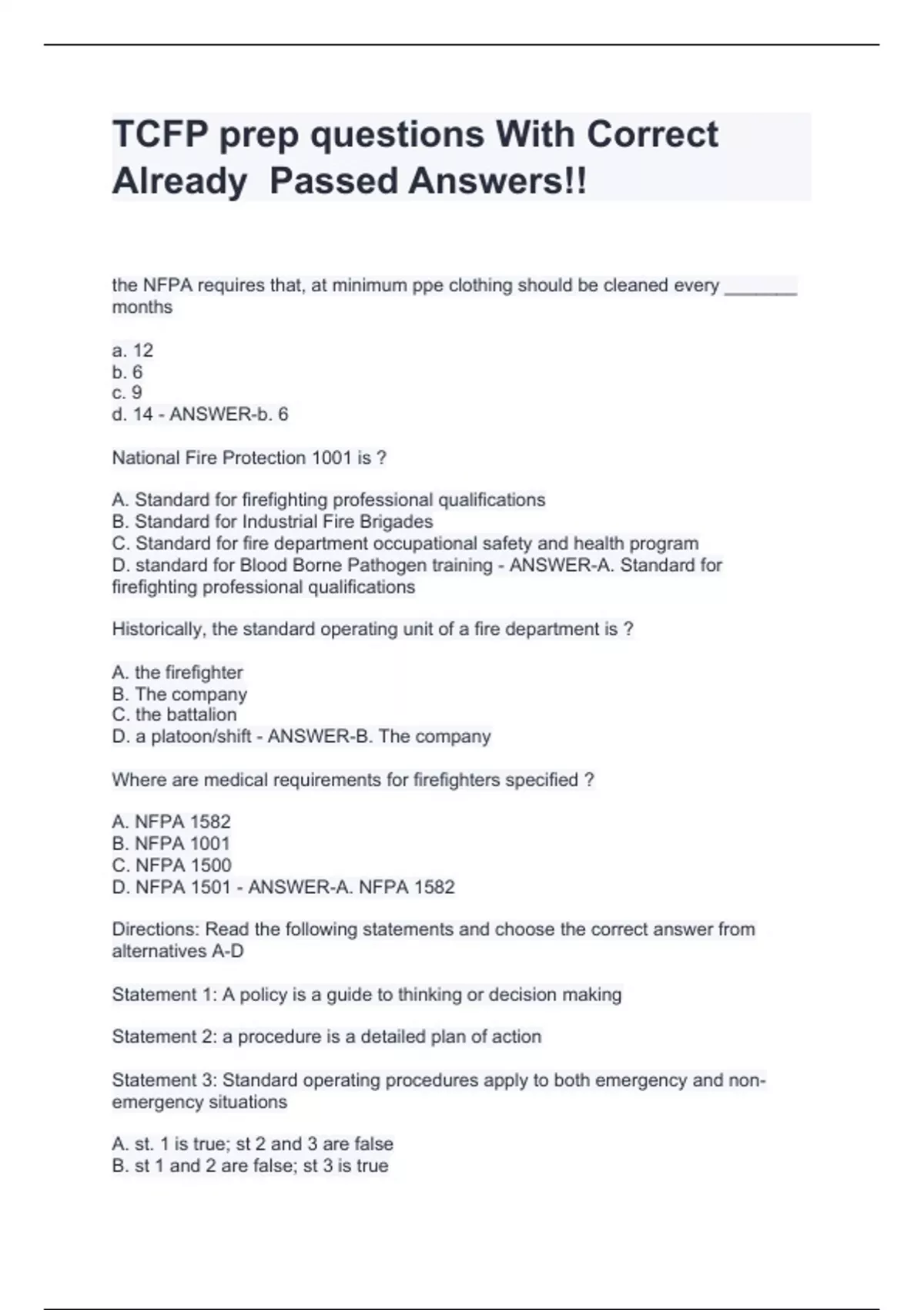 National Fire Protection 1001 is ? A. Standard for firefighting professional qualifications B. Standard for Industrial Fire Brigades C. Standard for fire department occupational safety and health program D. standard for Blood Borne Pathogen training - ANSWER-A. Standard for firefighting professional qualifications Historically, the standard operating unit of a fire department is ? A. the firefighter B. The company C. the battalion D. a platoon/shift - ANSWER-B. The company Where are medical requirements for firefighters specified ? A. NFPA 1582 B. NFPA 1001 C. NFPA 1500 D. NFPA 1501 - ANSWER-A. NFPA 1582 Directions: Read the following statements and choose the correct answer from alternatives A-D Statement 1: A policy is a guide to thinking or decision making Statement 2: a procedure is a detailed plan of action Statement 3: Standard operating procedures apply to both emergency and non-emergency situations A. st. 1 is true; st 2 and 3 are false B. st 1 and 2 are false; st 3 is true C. St 1 is false; st 2 and 3 are true