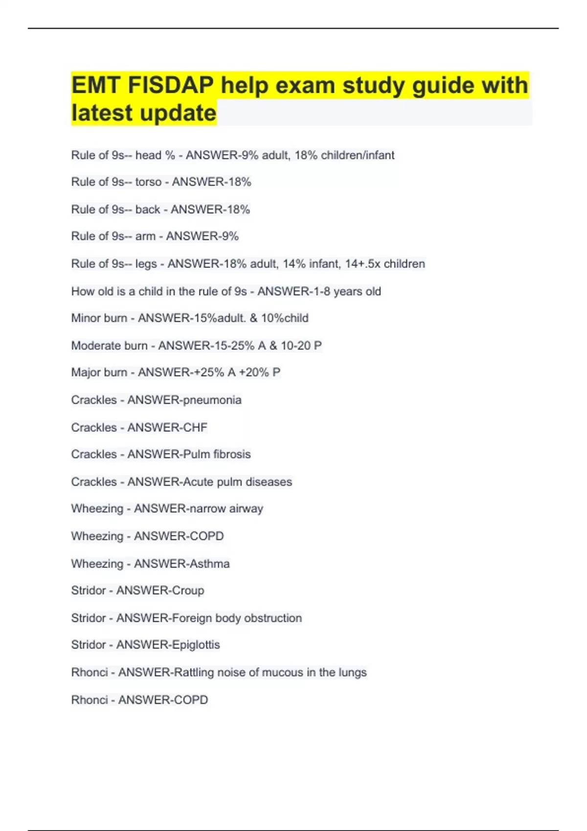 Rule of 9s-- head % - ANSWER-9% adult, 18% children/infant Rule of 9s-- torso - ANSWER-18% Rule of 9s-- back - ANSWER-18% Rule of 9s-- arm - ANSWER-9% Rule of 9s-- legs - ANSWER-18% adult, 14% infant, 14+.5x children How old is a child in the rule of 9s - ANSWER-1-8 years old Minor burn - ANSWER-15%adult. & 10%child Moderate burn - ANSWER-15-25% A & 10-20 P Major burn - ANSWER-+25% A +20% P Crackles - ANSWER-pneumonia Crackles - ANSWER-CHF Crackles - ANSWER-Pulm fibrosis Crackles - ANSWER-Acute pulm diseases Wheezing - ANSWER-narrow airway Wheezing - ANSWER-COPD Wheezing - ANSWER-Asthma Stridor - ANSWER-Croup Stridor - ANSWER-Foreign body obstruction Stridor - ANSWER-Epiglottis Rhonci - ANSWER-Rattling noise of mucous in the lungs Rhonci - ANSWER-COPD