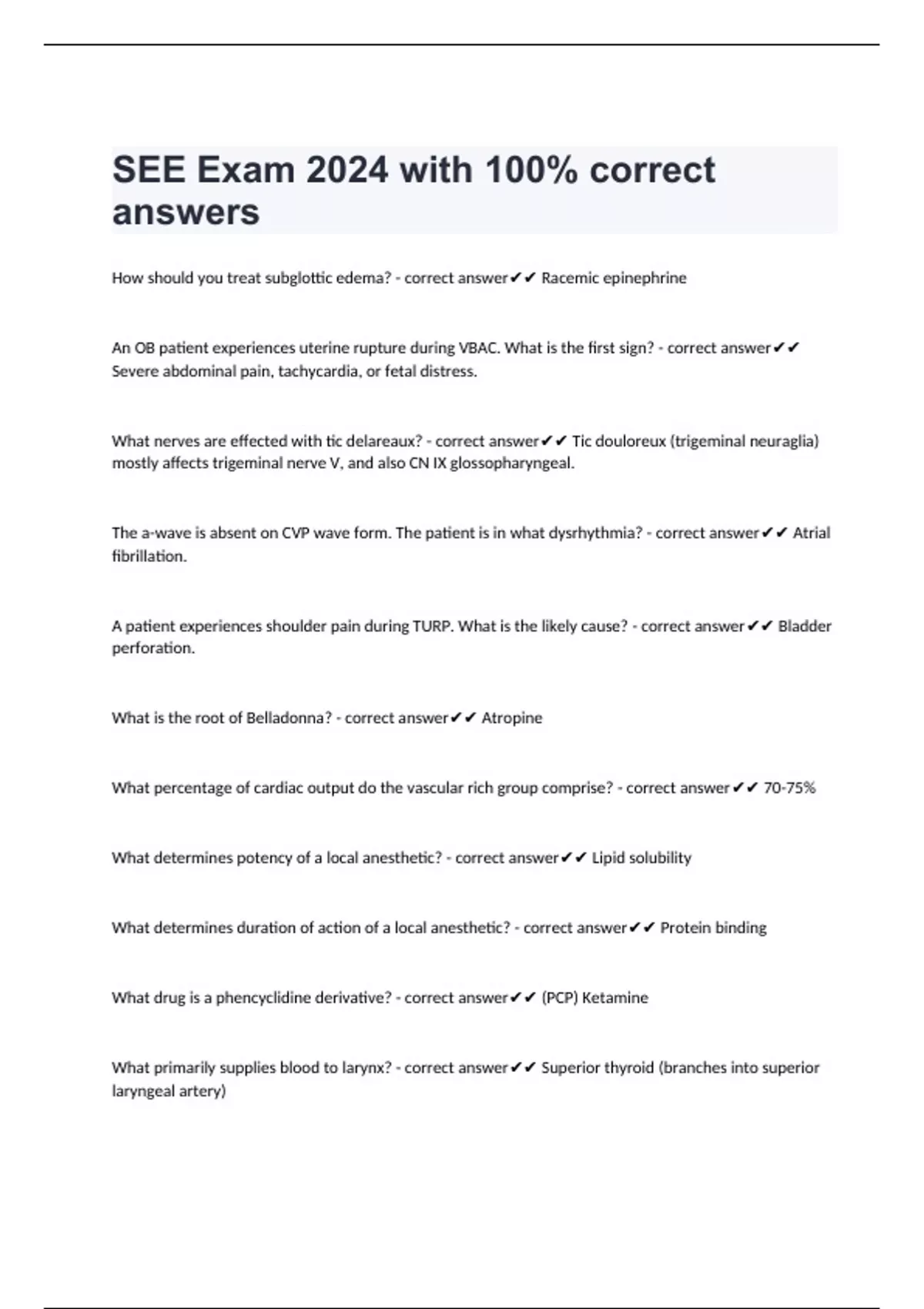 How should you treat subglottic edema? - correct answer Racemic epinephrine An OB patient experiences uterine rupture during VBAC. What is the first sign? - correct answer Severe abdominal pain, tachycardia, or fetal distress. What nerves are effected with tic delareaux? - correct answer Tic douloreux (trigeminal neuraglia) mostly affects trigeminal nerve V, and also CN IX glossopharyngeal. The a-wave is absent on CVP wave form. The patient is in what dysrhythmia? - correct answer Atrial fibrillation. A patient experiences shoulder pain during TURP. What is the likely cause? - correct answer Bladder perforation. What is the root of Belladonna? - correct answer Atropine What percentage of cardiac output do the vascular rich group comprise? - correct answer 70-75% What determines potency of a local anesthetic? - correct answer Lipid solubility What determines duration of action of a local anesthetic? - correct answer Protein binding What drug is a phencyclidine derivative? - correct answer (PCP) Ketamine