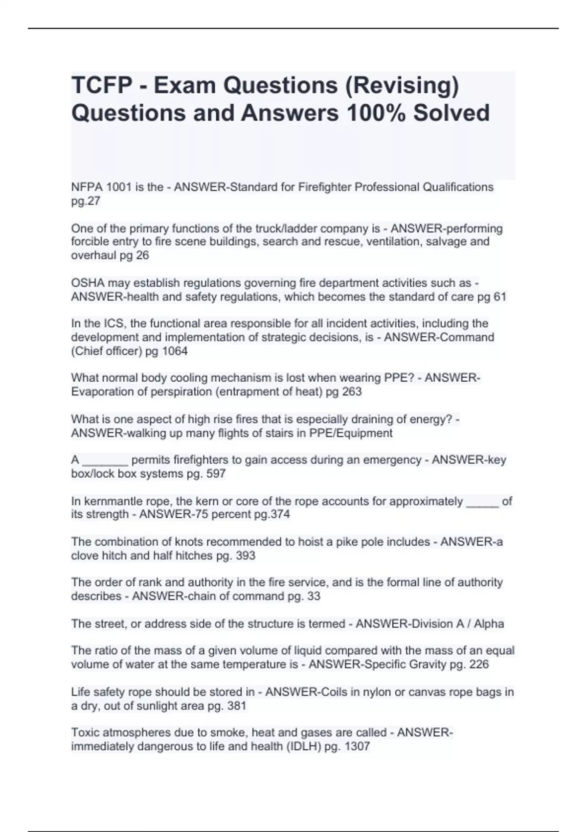 One of the primary functions of the truck/ladder company is - ANSWER-performing forcible entry to fire scene buildings, search and rescue, ventilation, salvage and overhaul pg 26 OSHA may establish regulations governing fire department activities such as - ANSWER-health and safety regulations, which becomes the standard of care pg 61 In the ICS, the functional area responsible for all incident activities, including the development and implementation of strategic decisions, is - ANSWER-Command (Chief officer) pg 1064 What normal body cooling mechanism is lost when wearing PPE? - ANSWER-Evaporation of perspiration (entrapment of heat) pg 263 What is one aspect of high rise fires that is especially draining of energy? - ANSWER-walking up many flights of stairs in PPE/Equipment A _______ permits firefighters to gain access during an emergency - ANSWER-key box/lock box systems pg. 597 In kernmantle rope, the kern or core of the rope accounts for approximately _____ of its strength - ANSWER-75 percent pg.374 The combination of knots recommended to hoist a pike pole includes - ANSWER-a clove hitch and half hitches pg. 393 The order of rank and authority in the fire service, and is the formal line of authority describes - ANSWER-chain of command pg. 33 The street, or address side of the structure is termed - ANSWER-Division A / Alpha The ratio of the mass of a given volume of liquid compared with the mass of an equal volume of water at the same temperature is - ANSWER-Specific Gravity pg. 226 Life safety rope should be stored in - ANSWER-Coils in nylon or canvas rope bags in a dry, out of sunlight area pg. 381 Toxic atmospheres due to smoke, heat and gases are called - ANSWER-immediately dangerous to life and health (IDLH) pg. 1307