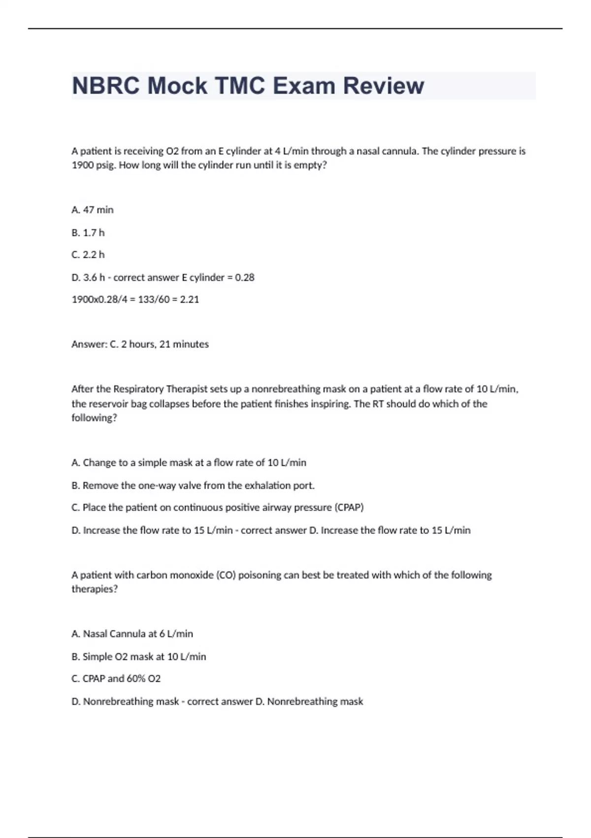 A patient is receiving O2 from an E cylinder at 4 L/min through a nasal cannula. The cylinder pressure is 1900 psig. How long will the cylinder run until it is empty? A. 47 min B. 1.7 h C. 2.2 h D. 3.6 h - correct answer E cylinder = 0.28 1900x0.28/4 = 133/60 = 2.21 Answer: C. 2 hours, 21 minutes After the Respiratory Therapist sets up a nonrebreathing mask on a patient at a flow rate of 10 L/min, the reservoir bag collapses before the patient finishes inspiring. The RT should do which of the following? A. Change to a simple mask at a flow rate of 10 L/min B. Remove the one-way valve from the exhalation port. C. Place the patient on continuous positive airway pressure (CPAP) D. Increase the flow rate to 15 L/min - correct answer D. Increase the flow rate to 15 L/min A patient with carbon monoxide (CO) poisoning can best be treated with which of the following therapies? A. Nasal Cannula at 6 L/min B. Simple O2 mask at 10 L/min C. CPAP and 60% O2 D.