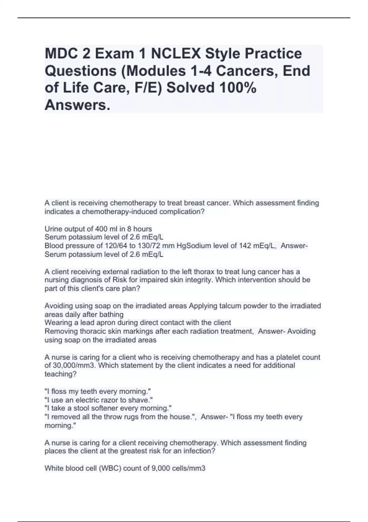 MDC 2 Exam 1 NCLEX Style Practice Questions (Modules 1-4 Cancers, End of Life Care, F/E) Solved 100% Answers.
