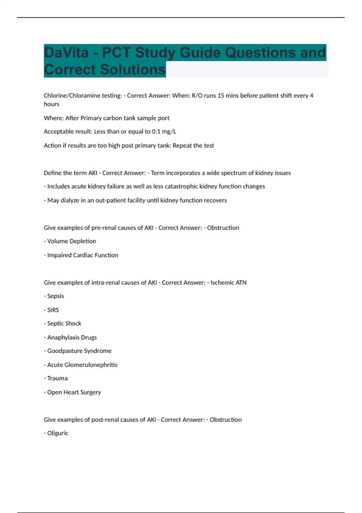 DaVita - PCT Study Guide Questions and Correct Solutions
