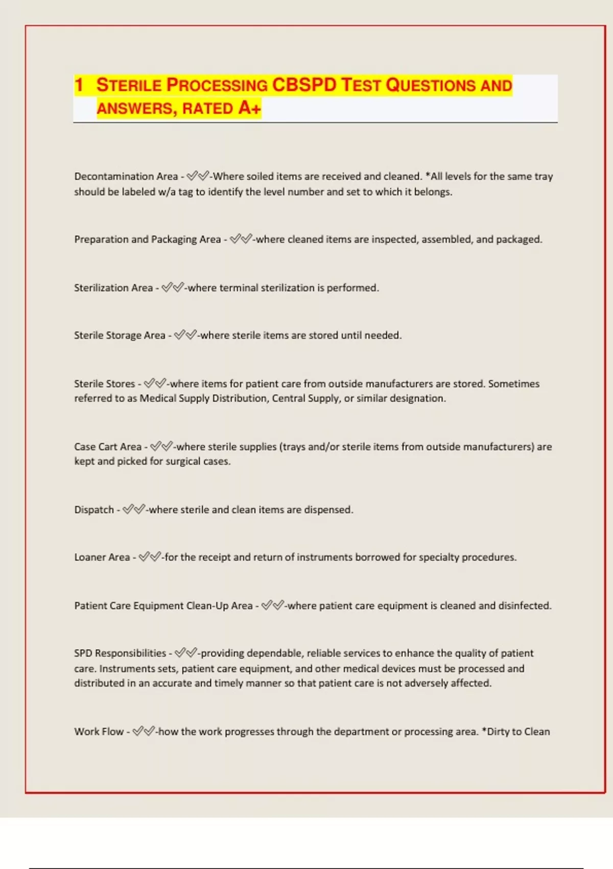 STERILE PROCESSING CBSPD TEST QUESTIONS AND ANSWERS, RATED A+ Decontamination Area - -Where soiled items are received and cleaned. *All levels for the same tray should be labeled w/a tag to identify the level number and set to which it belongs. Preparation and Packaging Area - -where cleaned items are inspected, assembled, and packaged. Sterilization Area - -where terminal sterilization is performed. Sterile Storage Area - -where sterile items are stored until needed. Sterile Stores - -where items for patient care from outside manufacturers are stored. Sometimes referred to as Medical Supply Distribution, Central Supply, or similar designation. Case Cart Area - -where sterile supplies (trays and/or sterile items from outside manufacturers) are kept and picked for surgical cases. Dispatch - -where sterile and clean items are dispensed. Loaner Area - -for the receipt and return of instruments borrowed for specialty procedures. Patient Care Equipment Clean-Up Area - -where patient care equipment is cleaned and disinfected. SPD Responsibilities - -providing dependable, reliable services to enhance the quality of patient care. Instruments sets, patient care equipment, and other medical devices must be processed and distributed in an accurate and timely manner so that patient care is not ad