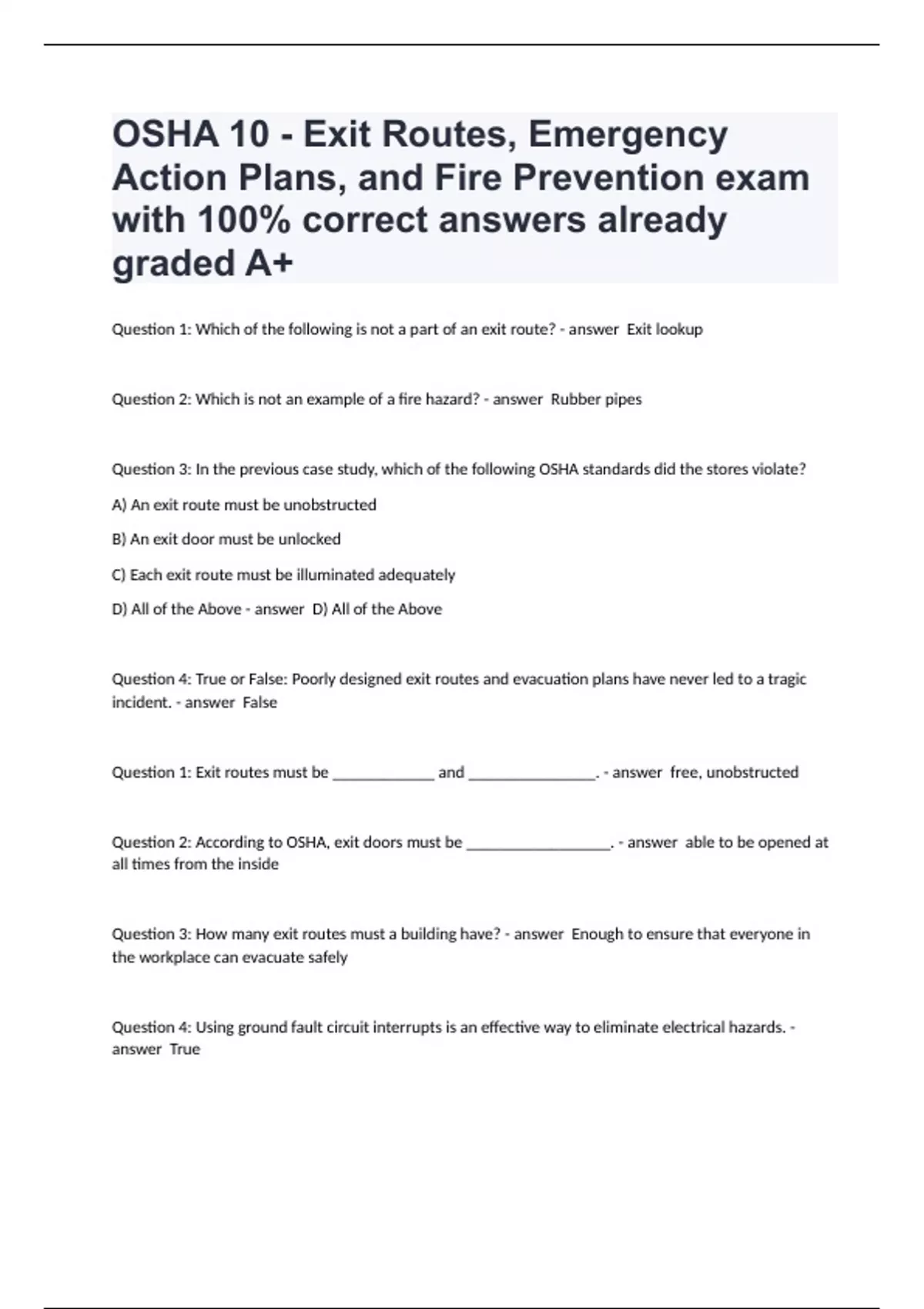 OSHA 10 - Exit Routes, Emergency Action Plans, and Fire Prevention exam with 100% correct answers