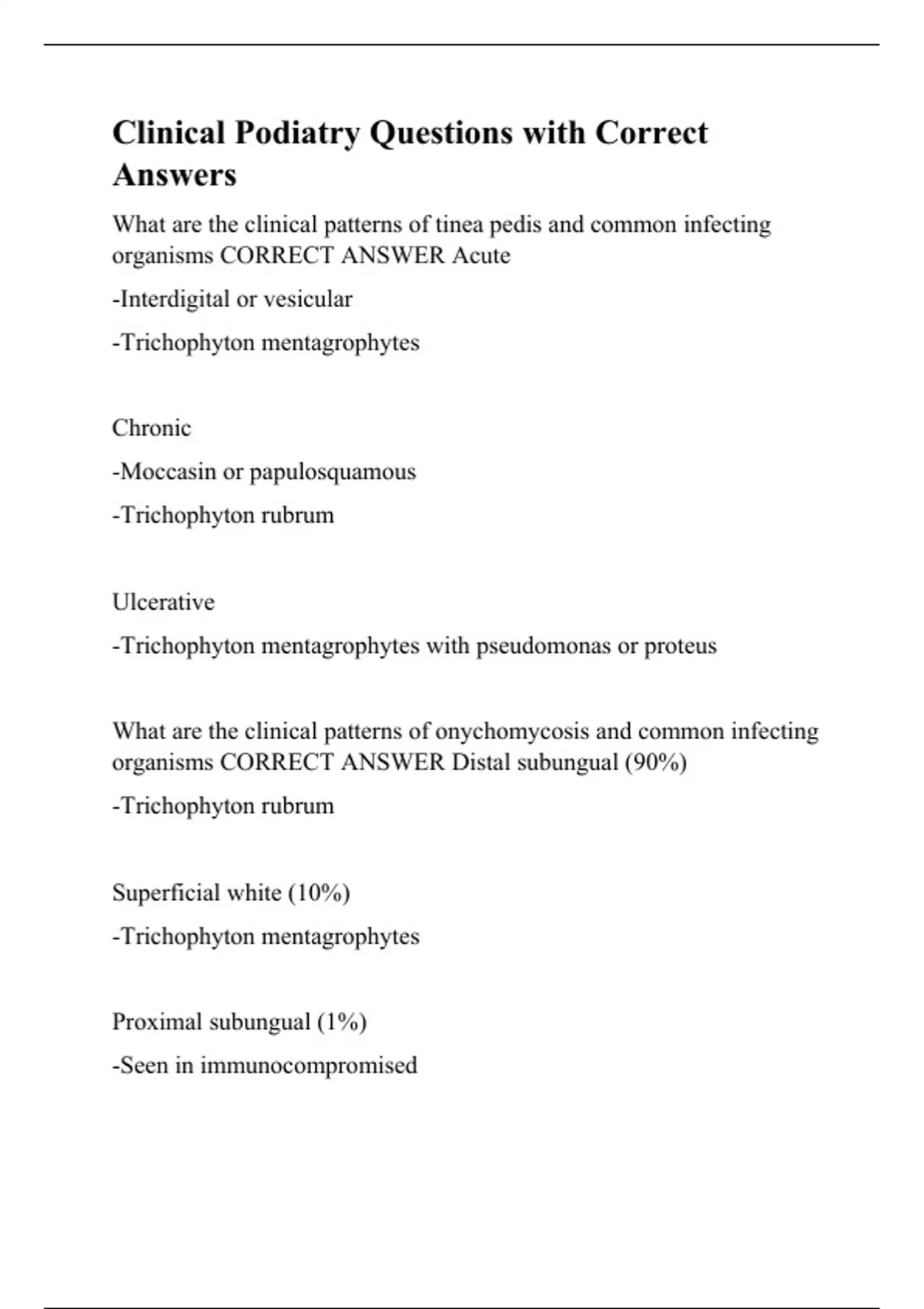 What are the clinical patterns of tinea pedis and common infecting organisms CORRECT ANSWER Acute -Interdigital or vesicular