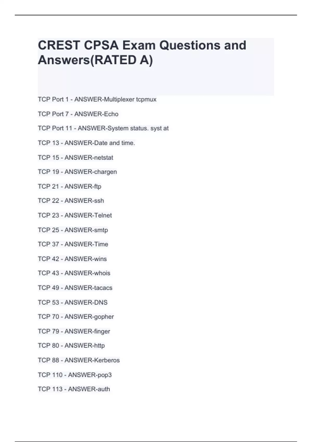 TCP Port 1 - ANSWER-Multiplexer tcpmux TCP Port 7 - ANSWER-Echo TCP Port 11 - ANSWER-System status. syst at TCP 13 - ANSWER-Date and time. TCP 15 - ANSWER-netstat TCP 19 - ANSWER-chargen TCP 21 - ANSWER-ftp TCP 22 - ANSWER-ssh TCP 23 - ANSWER-Telnet TCP 25 - ANSWER-smtp TCP 37 - ANSWER-Time TCP 42 - ANSWER-wins TCP 43 - ANSWER-whois TCP 49 - ANSWER-tacacs TCP 53 - ANSWER-DNS TCP 70 - ANSWER-gopher TCP 79 - ANSWER-finger TCP 80 - ANSWER-http TCP 88 - ANSWER-Kerberos TCP 110 - ANSWER-pop3 TCP 113 - ANSWER-auth