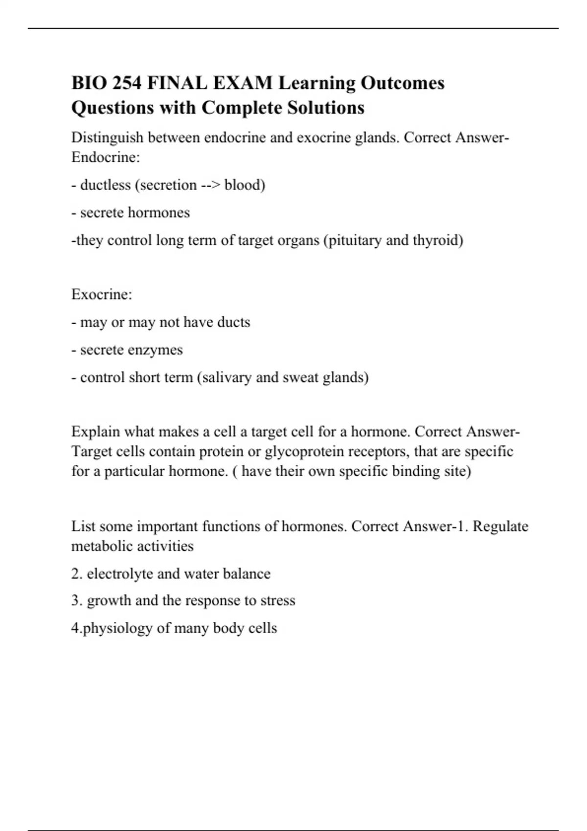 BIO 254 FINAL EXAM Learning Outcomes Questions with Complete Solutions