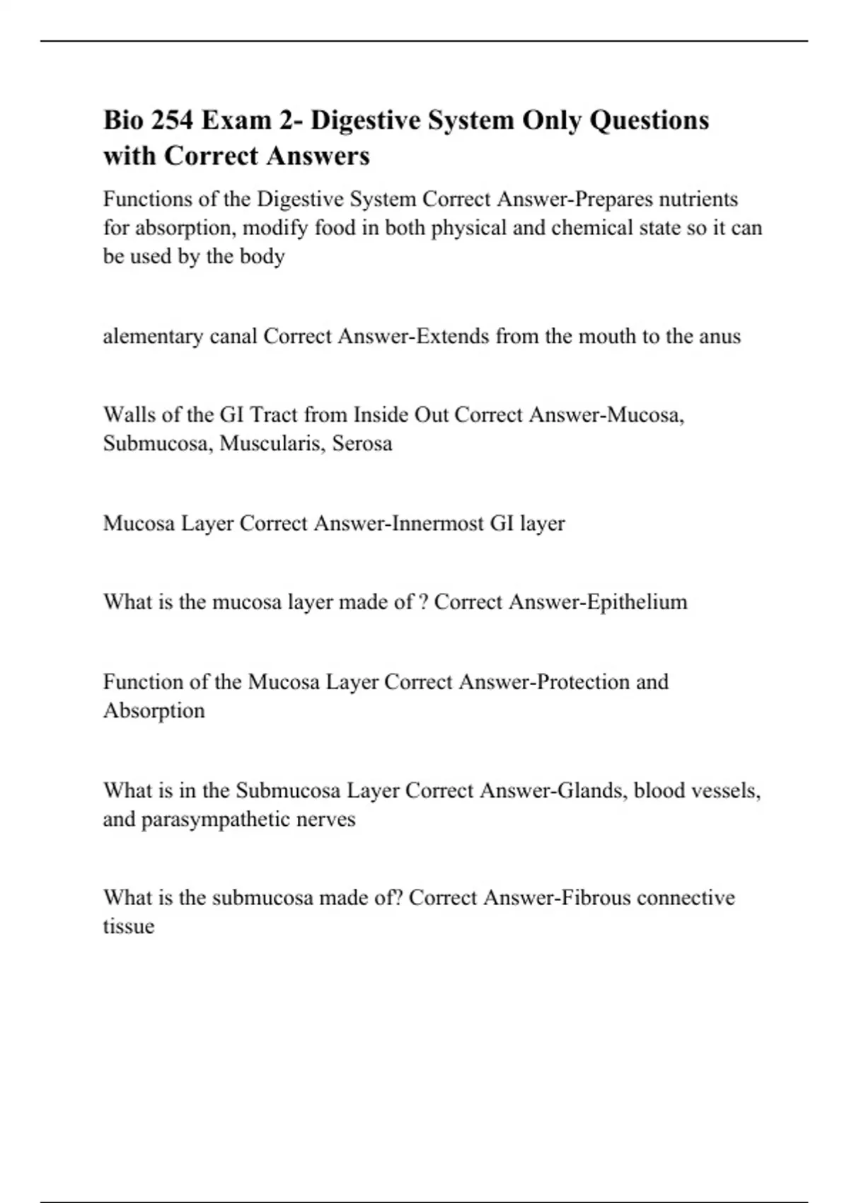 Bio 254 Exam 2- Digestive System Only Questions with Correct Answers