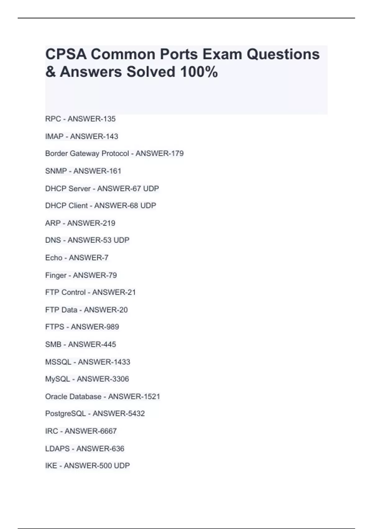 CPSA Common Ports Exam Questions & Answers Solved 100%