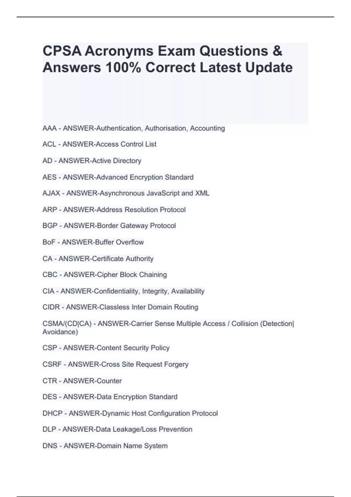 CPSA Acronyms Exam Questions & Answers 100% Correct Latest Update