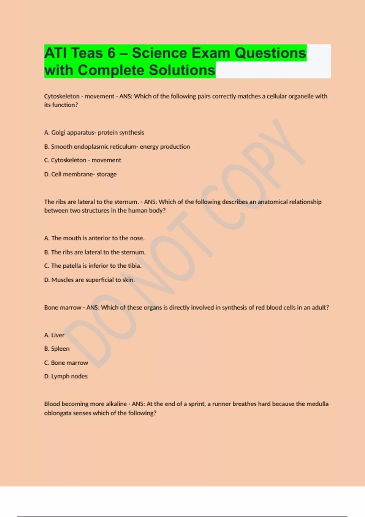 ATI Teas 6 – Science Exam Questions with Complete Solutions Cytoskeleton - movement - ANS: Which of the following pairs correctly matches a cellular organelle with its function? A. Golgi apparatus- protein synthesis B. Smooth endoplasmic reticulum- energy production C. Cytoskeleton - movement D. Cell membrane- storage The ribs are lateral to the sternum. - ANS: Which of the following describes an anatomical relationship between two structures in the human body? A. The mouth is anterior to the nose. B. The ribs are lateral to the sternum. C. The patella is inferior to the tibia. D. Muscles are superficial to skin. Bone marrow - ANS: Which of these organs is directly involved in synthesis of red blood cells in an adult? A. Liver B. Spleen C. Bone marrow D. Lymph nodes Blood becoming more alkaline - ANS: At the end of a sprint, a runner breathes hard because the medulla oblongata senses which of the following? A. Low oxygen levels in the blood B. Low carbon dioxide levels in the blood C. Blood becoming more alkaline D. Blood becoming more acidic Reduction in residual volume of the lung - ANS: Which of the following situations would result in increased oxygen diffusion from alveoli into blood? A. Increase in perfusion and decrease in ventilation B. Increase in oxygen concentration of blood C. Reduction in alveolar surface area D. Reduction in residual volume of the lung A. Walking pneumonia - 5 Mycoplasmic infection B. Cystic Fibrosis - 3 Gene Mutation C. Influenza - 1 Coronavirus D. Tuberculosis - 2 Mycobacterium E. Mycosis - 4 Fungus - ANS: Match the following respiratory system effects to their most probable cause. A. Walking pneumonia 1. Coronavirus B. Cystic Fibrosis 2. Mycobacterium C. Influenza 3. Gene Mutation D. Tuberculosis 4. Fungus E. Mycosis 5. Mycoplasmic infection Generation of electrical impulses - ANS: Which of the following describes a property of cardiac cells? A. Generation of electrical impulses B. Production of red blood cells C. Immune protection functions D. Removal of waste products from the body Antibodies - ANS: Which of the following blood component levels would be expected to increase following vaccination? A. Red blood cells B. Antibodies C. Dissolved gasses D. Leukocytes A. The sinoatrial node is present in the top section of the right atrium. - ANS: Which of the following statements regarding the circulatory system is correct? A. The sinoatrial node is present in the top section of the right atrium. B. Veins returning to the heart carry deoxygenated blood. C. The heart's "lub-dub" sound is caused by electrical impulse generation. D. The heart's atria have thicker walls than the ventricles. Peristalsis rate increases. - ANS: Which of the following physiological responses follows eating a large meal? A. Pulse rate increases. B. Peristalsis rate increases. C. Enzyme production decreases. D. Parasympathetic nervous activity decreases. The liver filters digestion products and produces urea as waste. - ANS: Which of the following describes why liver failure is a critical health emergency? A. The liver produces the majority of digestive enzymes. B. Food is filtered through the liver before digestion takes place. C. The liver helps digested food products to be pumped around the body. D. The liver filters digestion products and produces urea as waste. Salivary amylase - ANS: Carbohydrate-digesting enzyme produced by salivary glands Pepsinogen - ANS: Zymogen form of protease produced by the stomach Parietal cells - ANS: Cells that produce acid in the stomach Pyloric sphincter - ANS: Valve through which chyme passes from stomach to duodenum Gastrin - ANS: Hormone produced by stomach that induces stomach secretion. Cholecystokinin - ANS: Hormone that induces bile and pancreatic juice secertion. Jejunum - ANS: Second section of small intestine where majority of absorption occurs. Hepatic portal vein - ANS: Blood vessel that carries nutrients directly from small intestine to liver. Water - ANS: Substance mainly absorbed from waste in large intestine. Rectum - ANS: Region of large intestine in which feces is stored before elimination. Heart Beating - ANS: Which of the following actions is controlled by the autonomic nervous system? A. Walking B. Chewing C. Heart Beating D. Talking Chemical - ANS: Which of the following processes best describes how a signal travels across a nerve synapse? A. Electrical B. Kinetic C. Potential D. Chemical Protein - ANS: What is the primary component of muscles? A. Fat B. Protein C. Carbohydrates D. Nucleic Acid Testes - ANS: Which of the following organs produces sperm?