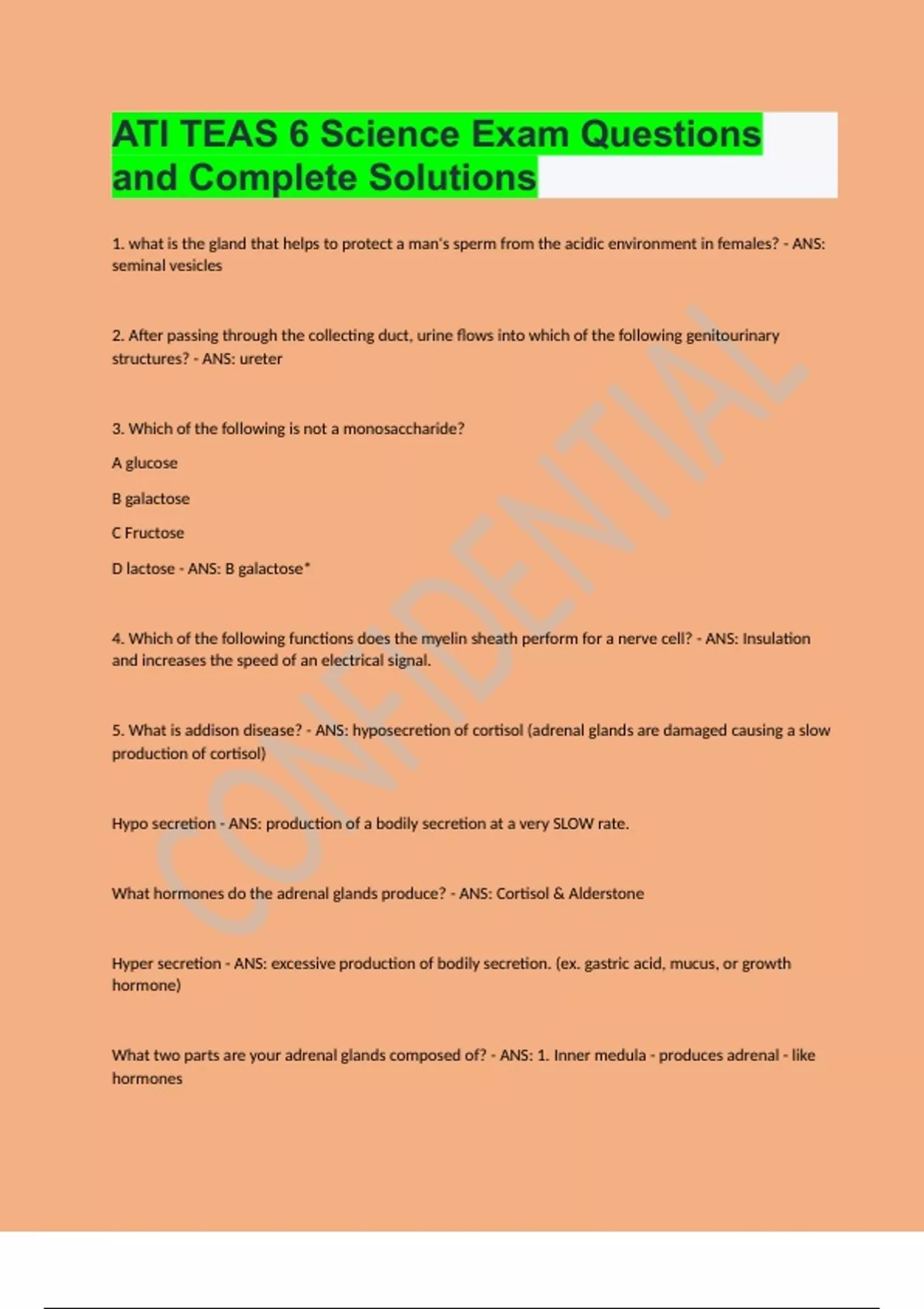 ATI TEAS 6 Science Exam Questions and Complete Solutions 1. what is the gland that helps to protect a man's sperm from the acidic environment in females? - ANS: seminal vesicles 2. After passing through the collecting duct, urine flows into which of the following genitourinary structures? - ANS: ureter 3. Which of the following is not a monosaccharide? A glucose B galactose C Fructose D lactose - ANS: B galactose* 4. Which of the following functions does the myelin sheath perform for a nerve cell? - ANS: Insulation and increases the speed of an electrical signal. 5. What is addison disease? - ANS: hyposecretion of cortisol (adrenal glands are damaged causing a slow production of cortisol) Hypo secretion - ANS: production of a bodily secretion at a very SLOW rate. What hormones do the adrenal glands produce? - ANS: Cortisol & Alderstone Hyper secretion - ANS: excessive production of bodily secretion. (ex. gastric acid, mucus, or growth hormone) What two parts are your adrenal glands composed of? - ANS: 1. Inner medula - produces adrenal - like hormones 2. Outer cortex - produces cortisol Amylase - ANS: Enzyme that converts starch and glycogen into simple sugars. Bile is produced, stored, and released into what organs in the body? - ANS: Produced in the liver, stored in the gall bladder, and released into the small intestine. Cortisol - ANS: A hormone produced by the adrenal glands (cortex). Increases blood sugar during stress and has anti-inflammatory properties. What is a proteolytic enzyme secreated by the pancreas? - ANS: Trypsin What is an enzyme that is capable of digesting proteins in an acid pH? - ANS: Pepsin What is the major enzyme for fat digestion and where is it produced? - ANS: Lipase - produced in the pancreas. What are the major enzymes for protein digestion? - ANS: Pepsin - produced in the gastric glands - released in stomach. Trypsin - produced in pancreas - released in small intestine. Peptidases - produced/released in small intestine. Trypsin - ANS: helps break down proteins into polypeptides or aa's. Produced in the pancreas. What are the major enzymes for carbohydrate digestion? - ANS: Salivary amylase - produced by salivary glands. Pancreatic amylase - produced by pancreas. Maltase - produced by small intestine. What are the major enzymes for nucleic digestion? - ANS: Nuclease - produced in pancreas. Nucleosidases - produced in pancreas. What digestive enzymes are produced in the pancreas? - ANS: Lipase - breakdown of fats Trypsin - breakdown of proteins. Amylase - breakdown of starch. What digestive enzymes are produced in the small intestine? - ANS: Maltase, sucrase, and lactase - breakdown of disaccharide's into monosaccharides. Peptidase - breakdown dipeptides into AA's. What digestive enzyme is produced by the stomach? - ANS: Pepsin - Breaks down proteins into polypeptides.