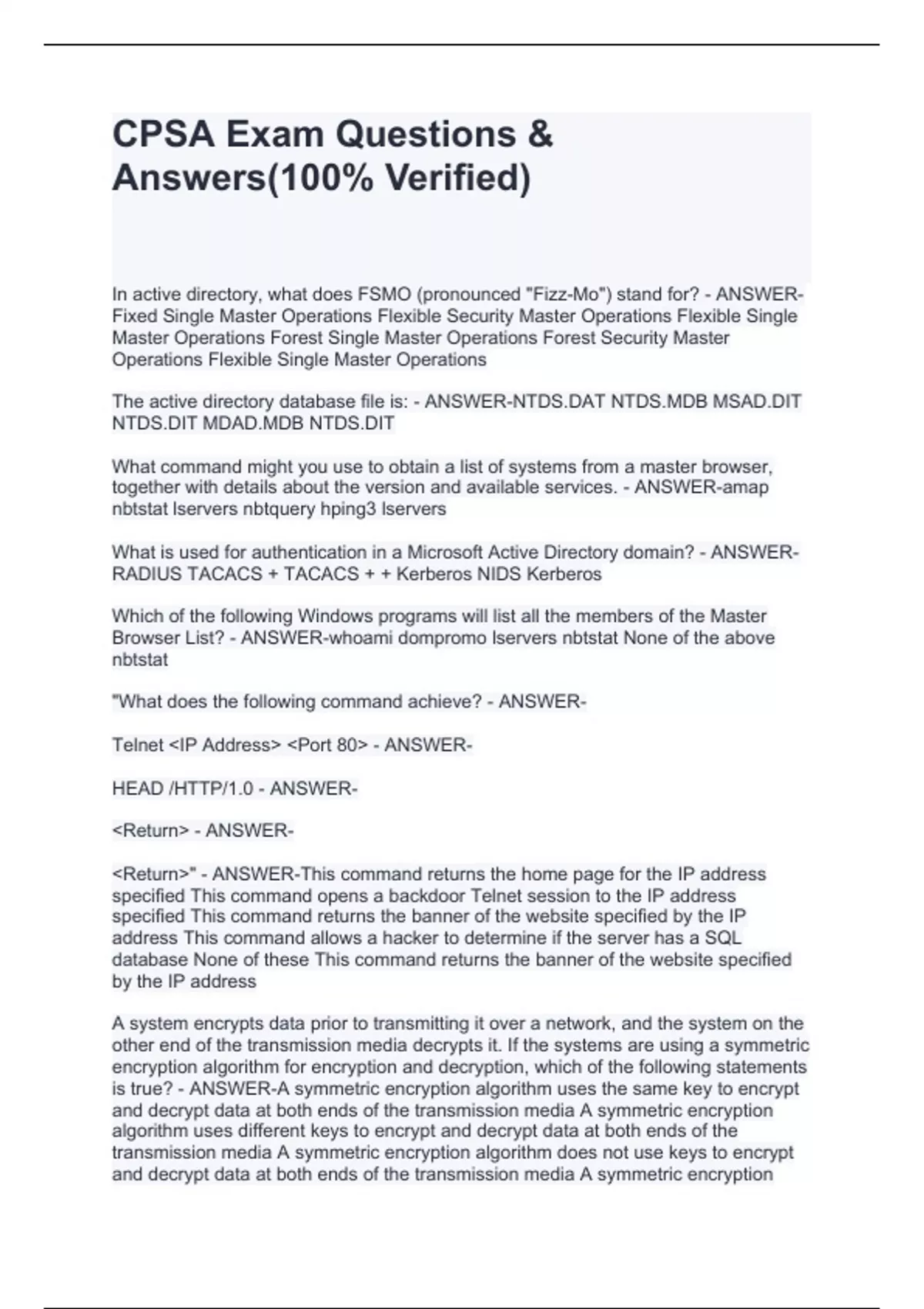 NTDS.DIT MDAD.MDB NTDS.DIT What command might you use to obtain a list of systems from a master browser, together with details about the version and available services. - ANSWER-amap nbtstat lservers nbtquery hping3 lservers What is used for authentication in a Microsoft Active Directory domain? - ANSWER-RADIUS TACACS + TACACS + + Kerberos NIDS Kerberos Which of the following Windows programs will list all the members of the Master Browser List? - ANSWER-whoami dompromo lservers nbtstat None of the above nbtstat "What does the following command achieve? - ANSWER- Telnet <IP Address> <Port 80> - ANSWER- HEAD /HTTP/1.0 - ANSWER- <Return> - ANSWER- <Return>" - ANSWER-This command returns the home page for the IP address specified This command opens a backdoor Telnet session to the IP address specified This command returns the banner of the website specified by the IP address This command allows a hacker to determine if the server has a SQL database None of these This command returns the banner of the website specified by the IP address A system encrypts data prior to transmitting it over a network, and the system on the other end of the transmission media decrypts it. If the systems are using a symmetric encryption algorithm for encryption and decryption, which of the following statements is true? - ANSWER-A symmetric encryption algorithm uses the same key to encrypt and decrypt data at both ends of the transmission media A symmetric encryption algorithm uses different keys to encrypt and decrypt data at both ends of the transmission media A symmetric encryption algorithm does not use keys to encrypt and decrypt data at both ends of the transmission media A symmetric