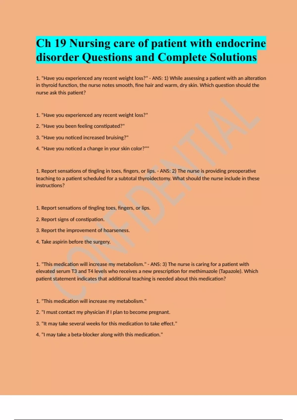 Ch 19 Nursing care of patient with endocrine disorder Questions and Complete Solutions
