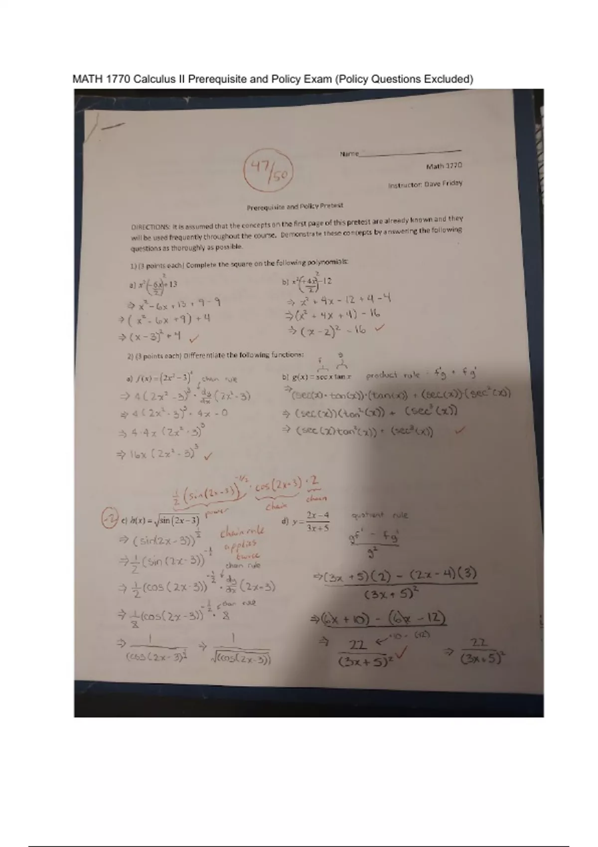 This course require s the passing of a prerequisite exam before continuing in the class by showing mastery of Calculus 1 concepts and topics. Questions in this exam include but are not limited to: completing the square of a quadratic function, differentiating functions with trigonometric applications and chain rule, understanding trigonometric identities, logarithm function simplification, implicit differentiation as well as determining critical points.
