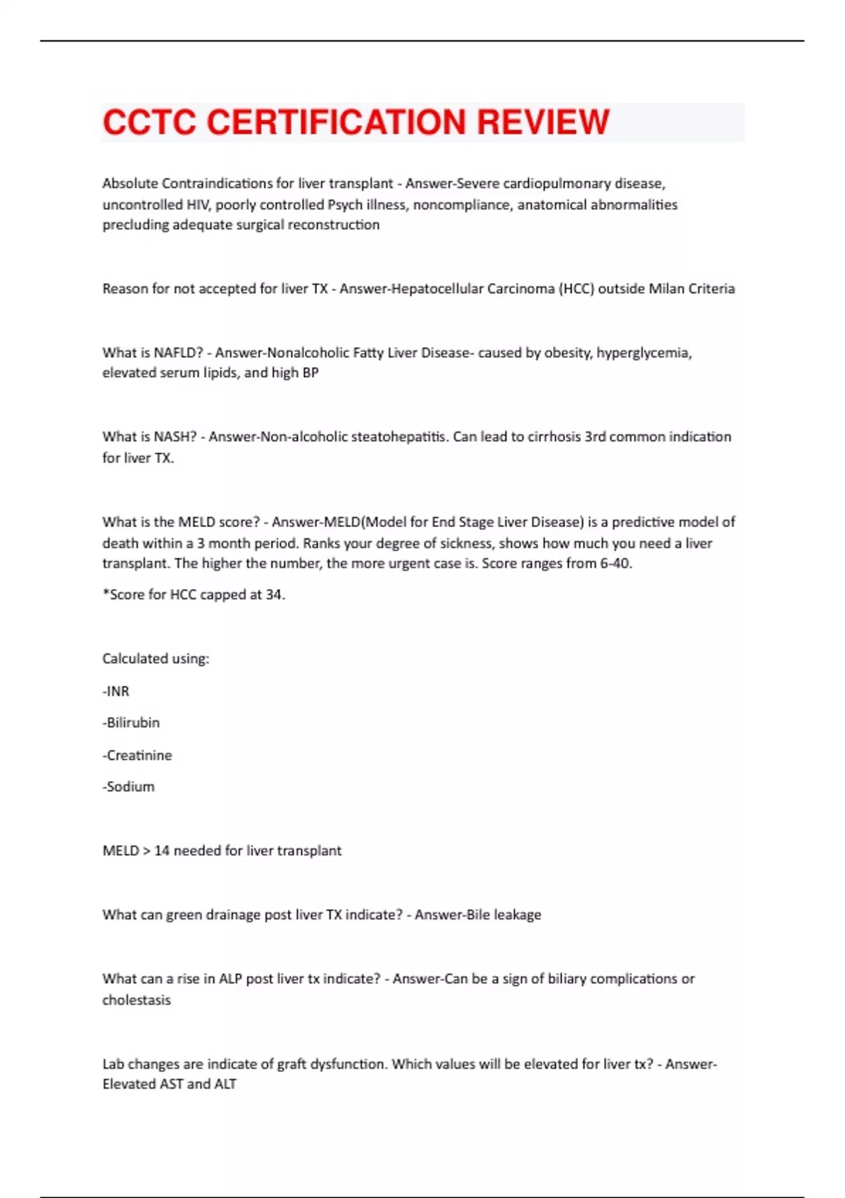 Absolute Contraindications for liver transplant - Answer-Severe cardiopulmonary disease, uncontrolled HIV, poorly controlled Psych illness, noncompliance, anatomical abnormalities precluding adequate surgical reconstruction Reason for not accepted for liver TX - Answer-Hepatocellular Carcinoma (HCC) outside Milan Criteria What is NAFLD? - Answer-Nonalcoholic Fatty Liver Disease- caused by obesity, hyperglycemia, elevated serum lipids, and high BP What is NASH? - Answer-Non-alcoholic steatohepatitis. Can lead to cirrhosis 3rd common indication for liver TX. What is the MELD score? - Answer-MELD(Model for End Stage Liver Disease) is a predictive model of death within a 3 month period. Ranks your degree of sickness, shows how much you need a liver transplant. The higher the number, the more urgent case is. Score ranges from 6-40. *Score for HCC capped at 34. Calculated using: -INR -Bilirubin -Creatinine -Sodium MELD > 14 needed for liver transplant What can green drainage post liver TX indicate? - Answer-Bile leakage What can a rise in ALP post liver tx indicate? - Answer-Can be a sign of biliary complications or cholestasis Lab changes are indicate of graft dysfunction. Which values will be elevated for liver tx? - AnswerElevated AST and ALTTarget levels for immunosuppressants are based on a number of factors including: - AnswerIndication for tx, use of induction therapy, kidney function, overall condition of pt. What can lead to metabolic encephalopathy post liver transplant? - Answer-Renal failure or sepsis What can lead to hypoxic ischemic encephalopathy post liver transplant? - Answer-Significant perioperative hypotension De Novo seizures can occur post liver transplant and can be caused by what? - Answer-Electrolyte imbalances, reaction to cyclosporine or tacrolimus, intracranial hemorrhage or cerebral infarction and intracerebral abscesses What can cause a post liver transplant patient whose initial postop neurological course is normal to develop sudden deterioration in neurological status? - Answer-Intracranial bleed Risk of primary non-function after liver transplant is: - Answer-4-6% Factors related to primary nonfunction of new liver include: - Answer-Donor age, prolonged cold ischemic time, prolonged donor hospital stay with periods of hypotension, preservation injury during donor surgery, and donor steatosis(fat in liver) Early Indicators of non functioning liver: - Answer-decrease in bile production extreme edema of organ Abnormal color of organ upon reperfusion(mottled, gray, pale) lack of reperfusion in OR urine output <30ml/hr hemodynamically unstable glucose, k, and lactate abnormalities Coagulopathy Clinical presentation for hepatic artery stenosis(HAT) - Answer-Increase in LFTs due to decreased blood flow through the hapatic artery to new organ Delayed bile leakPersistent sepsis of unknown cause What test is the gold standard for HAT diagnosis? - Answer-Angiography What is treatment for HAT? - Answer-Immediate return to OR for revascularization of organ Symptoms of bleeding post liver transplant include: - Answer-Increased swelling in abdomen Pallor Clinical manifestations of hypovolemia Some BP meds may increase cyclosporine or tacrolimus levels, name 2 - Answer-Diltiazem(Cardizem) Verapamil(Calan) What are causes of cholestasis post liver transplant - Answer-Rejection Sepsis Drug toxicity Preservation injury Clinical manifestations of cholestasis - Answer-Cloy or white stools Dark urine Itching Pain in upper right quadrant Jaundice Inability to digest certain foods N&V Locations of bile leaks post liver transplant - Answer-Anastomosis site T tube exit site Along the t tube tract at time of removal Within the liver as result of bile duct destruction(bile leak) From the cut surface in split liver, living donor transplant, or after biopsyCMV clinical manifestations - Answer-High fever, rigors, body aches, night sweats CMV prophylaxis - Answer-Valganciclovir ( valcyte) for 3 months