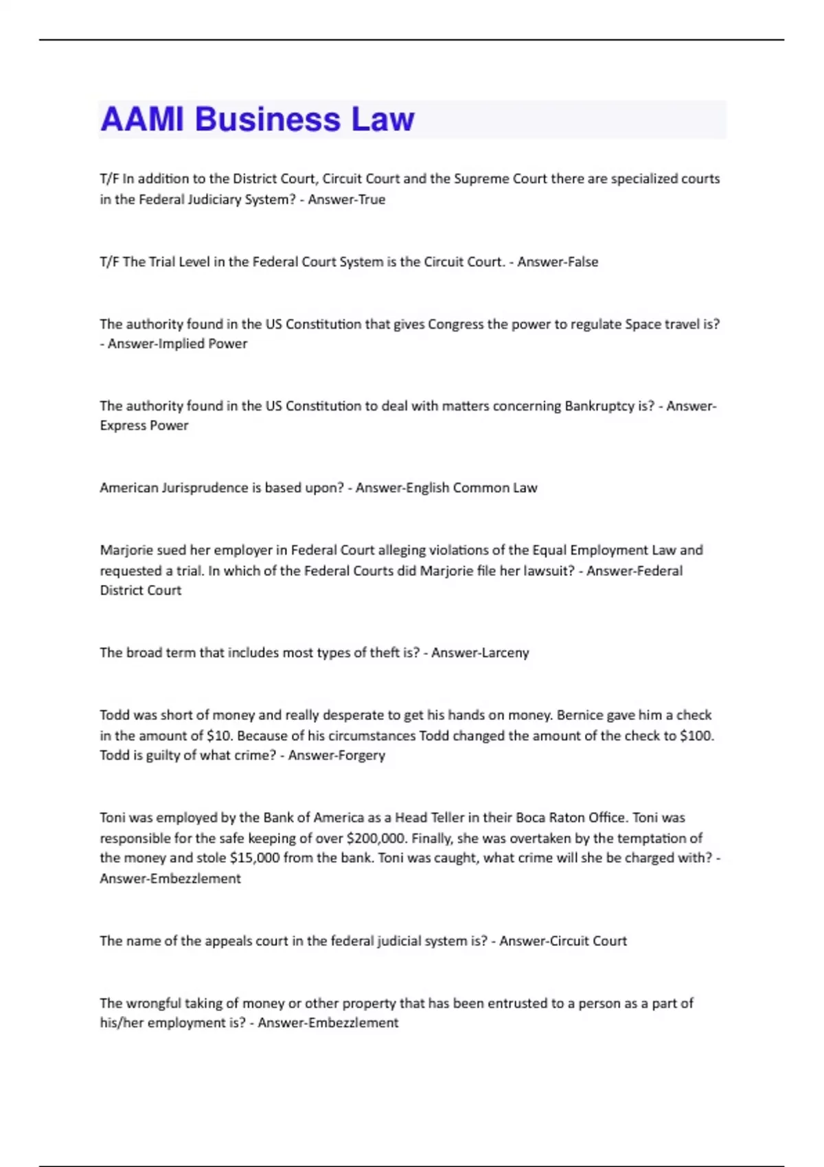 T/F In addition to the District Court, Circuit Court and the Supreme Court there are specialized courts in the Federal Judiciary System? - Answer-True T/F The Trial Level in the Federal Court System is the Circuit Court. - Answer-False The authority found in the US Constitution that gives Congress the power to regulate Space travel is? - Answer-Implied Power The authority found in the US Constitution to deal with matters concerning Bankruptcy is? - AnswerExpress Power American Jurisprudence is based upon? - Answer-English Common Law Marjorie sued her employer in Federal Court alleging violations of the Equal Employment Law and requested a trial. In which of the Federal Courts did Marjorie file her lawsuit? - Answer-Federal District Court The broad term that includes most types of theft is? - Answer-Larceny Todd was short of money and really desperate to get his hands on money. Bernice gave him a check in the amount of $10. Because of his circumstances Todd changed the amount of the check to $100. Todd is guilty of what crime? - Answer-Forgery Toni was employed by the Bank of America as a Head Teller in their Boca Raton Office. Toni was responsible for the safe keeping of over $200,000. Finally, she was overtaken by the temptation of the money and stole $15,000 from the bank. Toni was caught, what crime will she be charged with? - Answer-Embezzlement The name of the appeals court in the federal judicial system is? - Answer-Circuit Court The wrongful taking of money or other property that has been entrusted to a person as a part of his/her employment is? - Answer-EmbezzlementMarcia was a member of the Zoning Board for the Town of Westchester. The Bendix/Smith Company was petitioning the Zoning Board for a variance in order to build a multimillion-dollar mall. The Board consisted of 5 members and Marcia was the swing vote. Bendix/Smith contacted Marcia and offered to build her a swimming pool if she voted for the project. Marcia agreed to the plan. The Town Attorney found out about this transaction, what charges can be brought? - Answer-Bribery The crime of stealing a vehicle while in transit is? - Answer-Hijacking Marlene was a member of the Zoning Board of Chester Township. Heritage Construction Co., had an appeal pending before the Zoning Board for the building of 100 houses. If the variance is approved Heritage would profit over $1,000,000. Heritage wanted to make sure that the variance passed and contacted Marlene. Heritage was aware that Marlene had served 5 years in prison and that she had changed her name from Olga Smith to Marlene Jones in order to conceal her past. Heritage told Marlene that if she did not vote for the variance Heritage would broadcast her past. Marlene goes to the prosecutor and the prosecutor brings charges against Heritage. What charges are brought? - Answer-Extortion Mickey was sworn in and was testifying in a murder case before Judge Emmett. Mickey was afraid and really did not want to testify, but he was subpoenaed and had no choice. Mickey decided that the only way to protect himself was to lie and testify that he knew nothing. The Prosecutor brings charges against Mickey for lying under oath, what crime is Mickey charged with? - Answer-Perjury Which crimes involve the participation of 2 parties? - Answer-Extortion, Bribery Winona Ryder was on trial for stealing clothing from Sak's 5th Avenue. The crime that she was charged with is? - Answer-Shoplifting