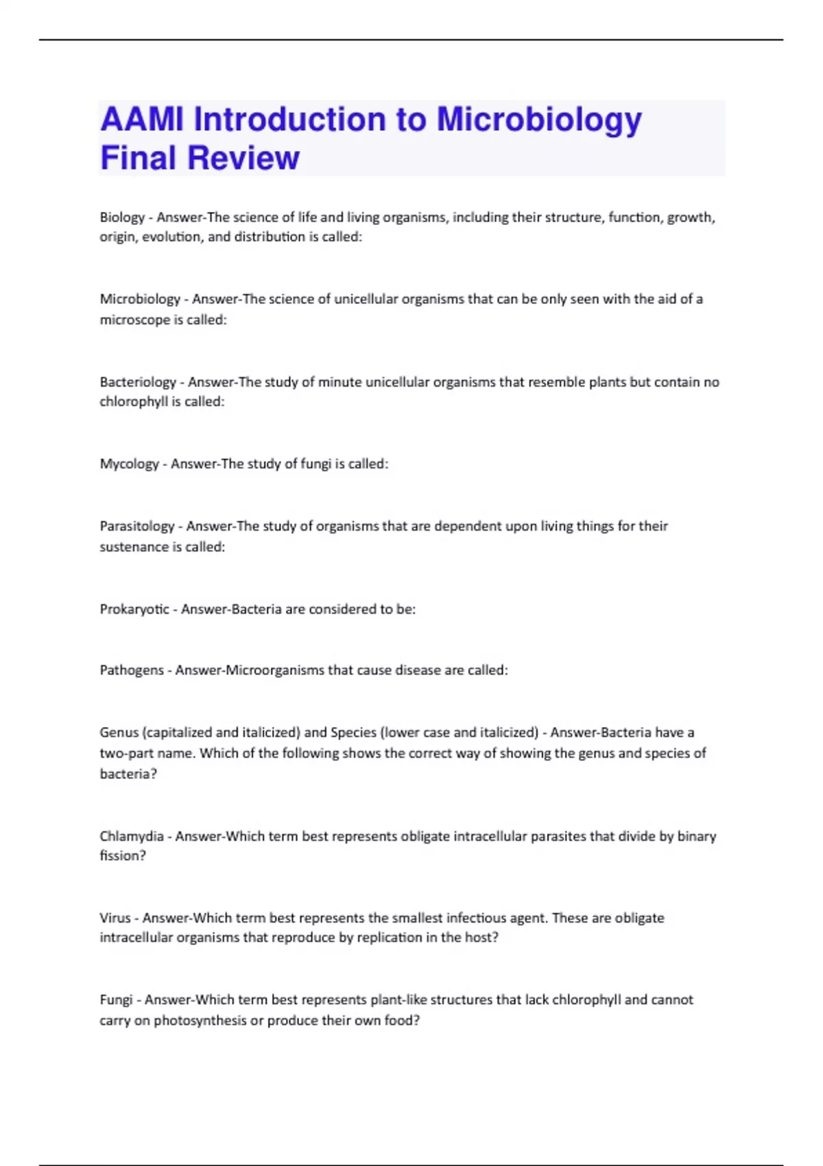 AAMI Introduction to Microbiology Final Review Questions With 100% Correct Solutions.