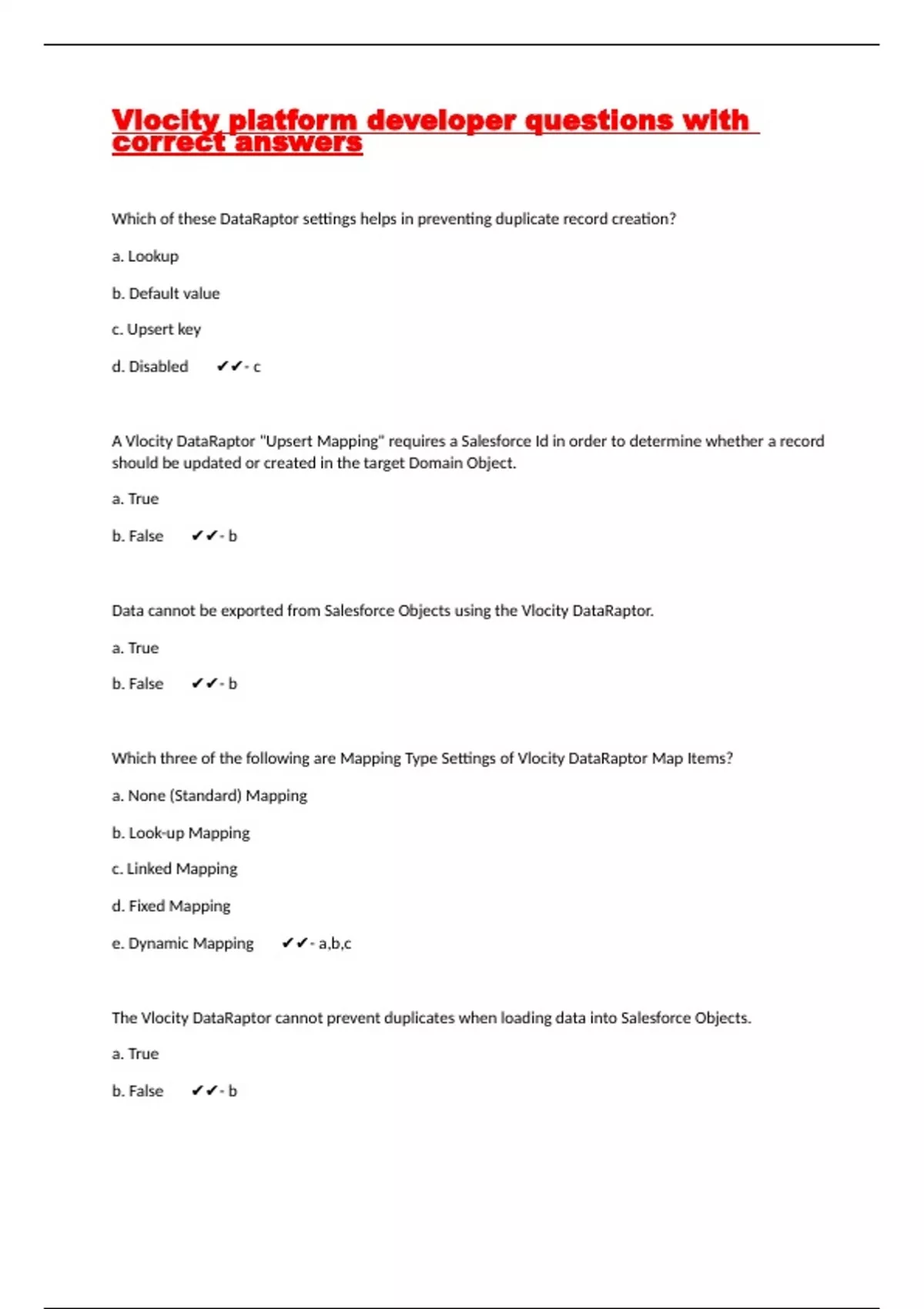 Which of these DataRaptor settings helps in preventing duplicate record creation? a. Lookup b. Default value c. Upsert key d. Disabled - c A Vlocity DataRaptor "Upsert Mapping" requires a Salesforce Id in order to determine whether a record should be updated or created in the target Domain Object. a. True b. False - b Data cannot be exported from Salesforce Objects using the Vlocity DataRaptor. a. True b. False - b Which three of the following are Mapping Type Settings of Vlocity DataRaptor Map Items? a. None (Standard) Mapping b. Look-up Mapping c. Linked Mapping d. Fixed Mapping e. Dynamic Mapping - a,b,c The Vlocity DataRaptor cannot prevent duplicates when loading data into Salesforce Objects. a. True b. False - b Which four of the following fields are required in a Vlocity DataRaptor Interface Object? a. DR Bundle Name b. DR Status c. DR Progress Data d. DR Error e. DR Custom Setting f. DR Mode - a,b,c,d During a Vlocity DataRaptor import job, a "Link Mapping" is used to get information, like a Salesforce Id, from a Domain Object record created previously in the Vlocity DataRaptor Creation Index. a. True b. False - a A Salesforce APEX Class can be created and then invoked to pre-process data when records are loaded into the Vlocity DataRaptor Interface Object. a. True b. False - a The Vlocity DataRaptor cannot be used in conjunction with a Vlocity OmniScript to load in, or export out, JSON data. a. True b. False - b Which four of the following are features of Vlocity DataRaptor: a. Load Data into multiple Salesforce Objects from a single flat file b. Gather and Export data from multiple Salesforce Objects to a single output file c. Import data without needing Salesforce Ids or External Ids d. Integrate with external systems via REST API Calls e. Upload data directly from network directories f. Import rich media files such as .jpg and .mp4 - a,b,c,d The JSON output of a vlocity OmniScript can be sent to and processed by a Vlocity DataRaptor a. True b. False - a A Vlocity DataRaptor "Lookup Mapping" queries an existing Domain Object to resolve foreign key relationships for data loaded in the Interface Object. A. True B. False - a It is not possible to mark multiple mappings with the "Upsert" attribute. A. True B. False - b The targeted "Link Creation Object" in a Vlocity DataRaptor "Link Mapping" must be higher in the "Creation Sequence" than the "Domain Object" receiving data from the Link Creation Object. A. True B. False - a Which four of the following objects are pre-configured as sources for Customer Story cards in the Vlocity package? A. Account Case B. Account Note C. Account Task D. Account Event E. Account Assets F. Account Contacts - a,b,c,d It is not possible to configure Vlocity Customer Story pages for Objects other than ones provided in the Vlocity package. A. True B. False - b What actions are possible in the XML interface in the card layout? (pick 2) A. Enable or disable the component as public or private B. Set the component name you'll see in the app builder C. Activate the cards and the card layout in the card designer D. Set the component name you'll see in the card designer - a,b Which context variable is set in the card designer and allows access to any property in scope plus the {{payload}} variable? a. Attributes {{attrs}} b. Page parameters {{params}} c. Session variables {{session}} d. Object {{objj}} - c