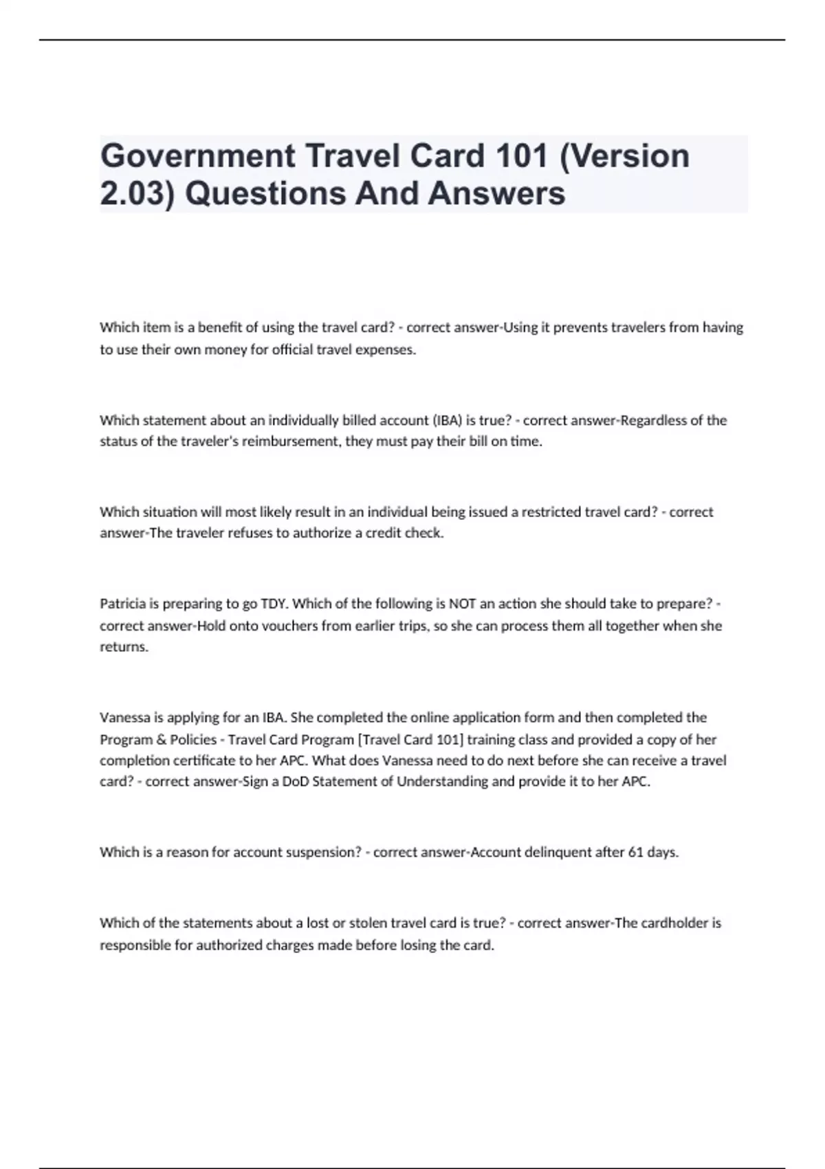 Government Travel Card 101 (Version 2.03) Questions And Answers