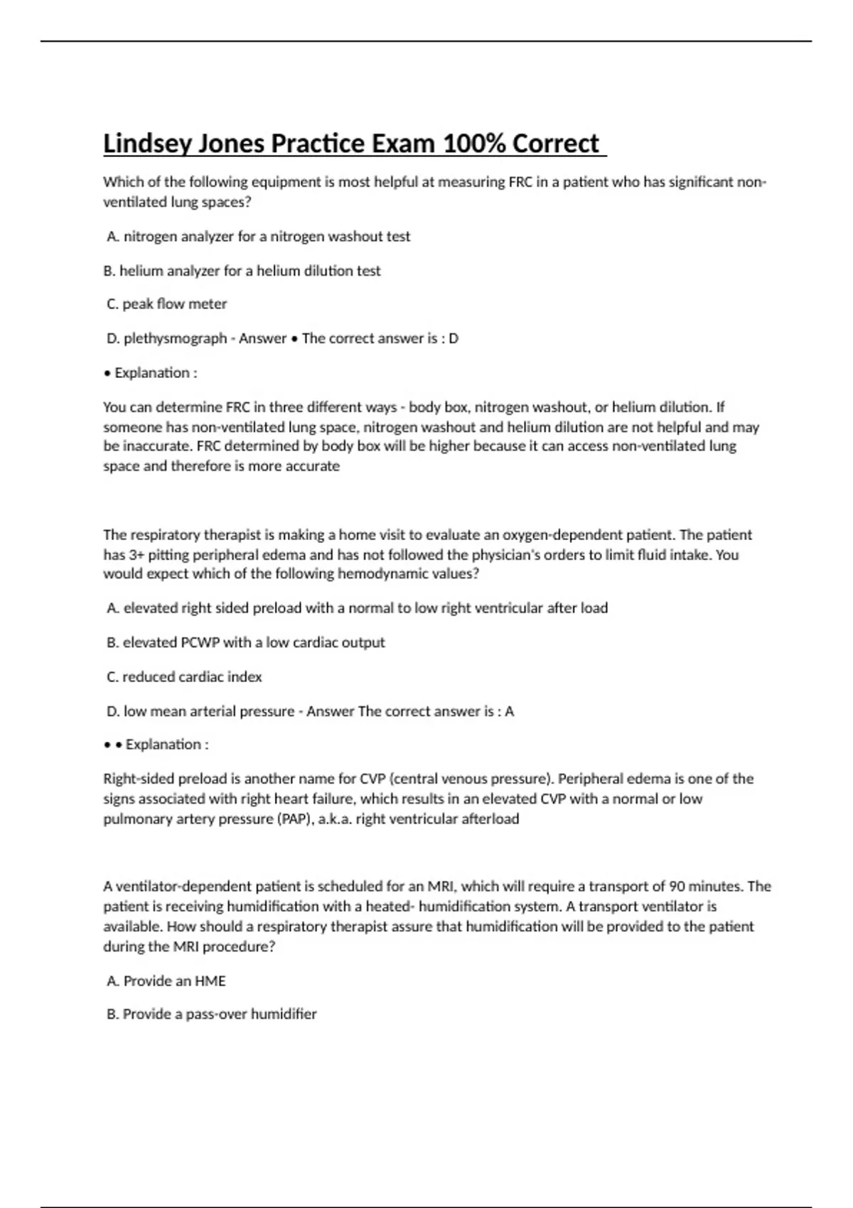 Which of the following equipment is most helpful at measuring FRC in a patient who has significant non-ventilated lung spaces? A. nitrogen analyzer for a nitrogen washout test B. helium analyzer for a helium dilution test C. peak flow meter D. plethysmograph - Answer • The correct answer is : D • Explanation : You can determine FRC in three different ways - body box, nitrogen washout, or helium dilution. If someone has non-ventilated lung space, nitrogen washout and helium dilution are not helpful and may be inaccurate. FRC determined by body box will be higher because it can access non-ventilated lung space and therefore is more accurate The respiratory therapist is making a home visit to evaluate an oxygen-dependent patient. The patient has 3+ pitting peripheral edema and has not followed the physician's orders to limit fluid intake. You would expect which of the following hemodynamic values? A. elevated right sided preload with a normal to low right ventricular after load B. elevated PCWP with a low cardiac output C. reduced cardiac index D. low mean arterial pressure - Answer The correct answer is : A • • Explanation : Right-sided preload is another name for CVP (central venous pressure). Peripheral edema is one of the signs associated with right heart failure, which results in an elevated CVP with a normal or low pulmonary artery pressure (PAP), a.k.a. right ventricular afterload A ventilator-dependent patient is scheduled for an MRI, which will require a transport of 90 minutes. The patient is receiving humidification with a heated- humidification system. A transport ventilator is available. How should a respiratory therapist assure that humidification will be provided to the patient during the MRI procedure? A. Provide an HME B. Provide a pass-over humidifier C. Provide ventilation with a manual resuscitator D. Use the same humidification system in use on the primary ventilation - Answer • The correct answer is : A • • Explanation : A heat moisture exchanger (HME) is appropriate for a transport of only 90 min. Furthermore, the scenario does not suggest that the patient has thick, retained secretions, therefore an HME may be applied Which of the following conditions would benefit most from polysomnography? A. obesity with increased day-time sleepiness B. suspected increased airway resistance C. congestive heart failure D. COPD - Answer • The correct answer is : A • • Explanation : Polysomnography is another word for sleep study. An obese patient who has daytime sleepiness would benefit most from polysomnography. Keep in mind that Polysomnography is the study of the problem - not the solution. But it must be done for diagnostic purposes and in order to find the adequate CPAP setting Which of the following can accurately be stated about a widening alveolar-arterial oxygen gradient? A. improving V/Q mismatch B. decreased venous admixture C. increased intrapulmonary shunting D. onset of oxygen toxicity - Answer • The correct answer is : C • Explanation : A normal alveolar arterial oxygen gradient is below 65 mmHg. When that gradient rises to 200, 300, 400, or more, then you have what is called shunting. If the A-a gradient is less than 300 it's technically called a ventilation perfusion (VQ) mismatch. But generally speaking, as the gradient widens it can properly be said that there is an increase in pulmonary shunting. How many hours will an H cylinder with 1400 psi last for a patient receiving oxygen at 7 lpm? A. 6 hours B. less than 1 hour C. 4 hours D. 10 hours - Answer • The correct answer is : D • • Explanation : And H cylinder has a tank factor of 3.14. 3.14x1400 PSI = 4396 L. 4396 L / 7 L per minute = 628 min. 628 min./ 60 min.= 10.4 hours, or about 10 hours. When you get an answer that is not exact, pick the closest number possible. It is common on the exam not see the exact answer from your calculation. This is because the NBRC knows that you're estimating The respiratory therapist notes a fall in pulse from 80/min to 60/min with a proportional drop in blood pressure during a suction procedure. Which of the following would be the most likely cause of these observations? A. Vagal reflex B. Transient hypoxemia C. Suction pressure is too high D. Copious secretions - Answer • The correct answer is : A • • Explanation : During suctioning, a patient's heart rate may fall. This is a normal physiological response associated with the vagal reflex, or the vagal nerve response. This response will also lower blood pressure A bronchopleural fistula on a patient receiving mechanical ventilation with a chest tube drainage system in place would be most likely be indicated by which of the following observations? • A. I:E ratio alarms • B. excess bubbling in the water seal chamber • C. occasional low-exhaled volume alarm • D. high pressure ventilator alarm - Answer • The correct answer is : B • • Explanation : A bronchopleural fistula is essentially a leak from the airway in the lungs to the pleural space. This condition can result in two things - one) a low-pressure or low-volume alarm, 2) excess bubbling in the water seal chamber of the chest tube drainage system. When you look at the answers, a leak would not cause a high pressure alarm The best test determination for a forced vital capacity maneuver is done by which of the following calculations? • A. FEV1 + FVC • B. SVC + FVC • C. TLC - FVC • D. FEV1/FVC - Answer • The correct answer is : A • • Explanation : To determine the best trial or best patient effort for a forced vital capacity maneuver, the trial with the highest sum of the FEV1 and FVC is considered to be the patient's best effort. Which of the following medications would be helpful at reversing the affect of a benzodiazepine medication? • A. Romazicon • B. Narcan • C. Versed • D. Norcuron - Answer • The correct answer is : A • • Explanation : Romazicon is the only medication on the list that can revers