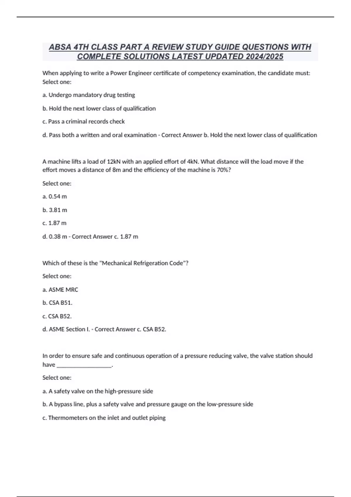 ABSA 4TH CLASS PART A REVIEW STUDY GUIDE QUESTIONS WITH COMPLETE SOLUTIONS LATEST UPDATED 2024/2025 When applying to write a Power Engineer certificate of competency examination, the candidate must: Select one: a. Undergo mandatory drug testing b. Hold the next lower class of qualification c. Pass a criminal records check d. Pass both a written and oral examination - Correct Answer b. Hold the next lower class of qualification A machine lifts a load of 12kN with an applied effort of 4kN. What distance will the load move if the effort moves a distance of 8m and the efficiency of the machine is 70%? Select one: a. 0.54 m b. 3.81 m c. 1.87 m d. 0.38 m - Correct Answer c. 1.87 m Which of these is the "Mechanical Refrigeration Code"? Select one: a. ASME MRC b. CSA B51. c. CSA B52. d. ASME Section I. - Correct Answer c. CSA B52. In order to ensure safe and continuous operation of a pressure reducing valve, the valve station should have _________________. Select one: a. A safety valve on the high-pressure side b. A bypass line, plus a safety valve and pressure gauge on the low-pressure side c. Thermometers on the inlet and outlet piping d. A strainer immediately downstream of the valve - Correct Answer b. A bypass line, plus a safety valve and pressure gauge on the lo